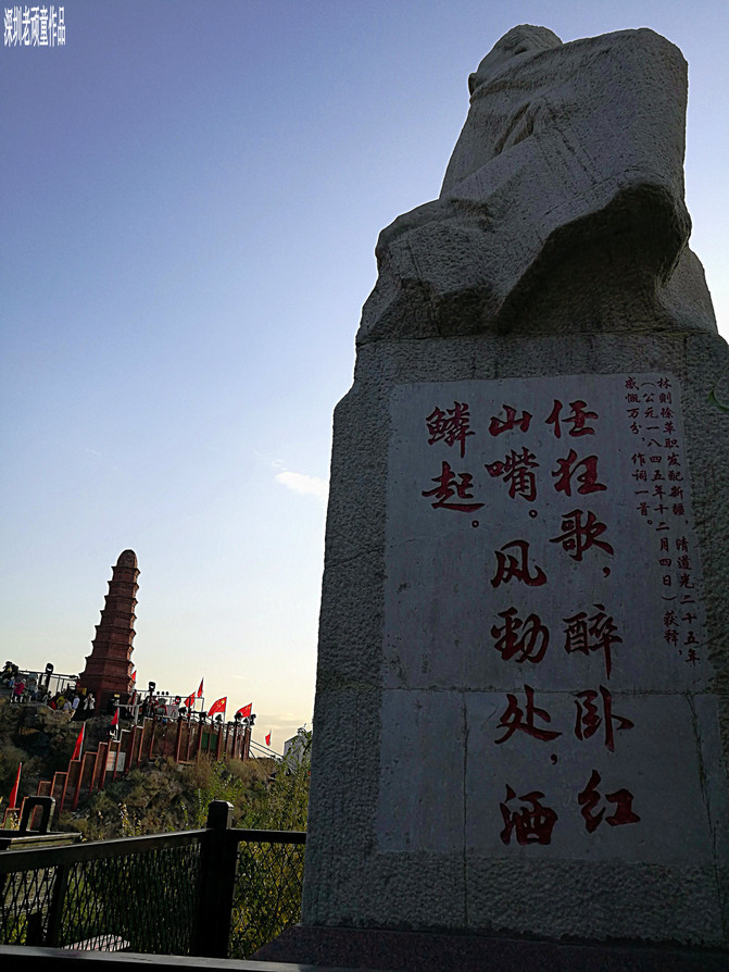 告别了相处了几天几夜的南疆之都--喀什,第二次踏入了新疆首府乌鲁木齐市。第一站来到了位于市中心著名的《红山公园》,像一条红色的巨龙昂首横卧在乌鲁木齐河的东岸。其西端山体巍峨,海拔九百多米,因断崖呈褐红色壮丽美观,所以人们称之为“红山”。山顶上耸立一座家乡民族英雄林则徐巍峨壮观的雕像,底座刻上林则徐流放新疆于一八四五年十二月获释,非常感慨写下了一首气吞山河无比悲壮的诗词。而雕像在夕阳光线照射下,更加体现英雄一生轰轰烈烈和命运坎坷的人物塑造。在红山公园半山腰有一个城市观景台,站在此处俯瞰城市天际线,秋景已渐现,赏心悦目,心胸开阔。