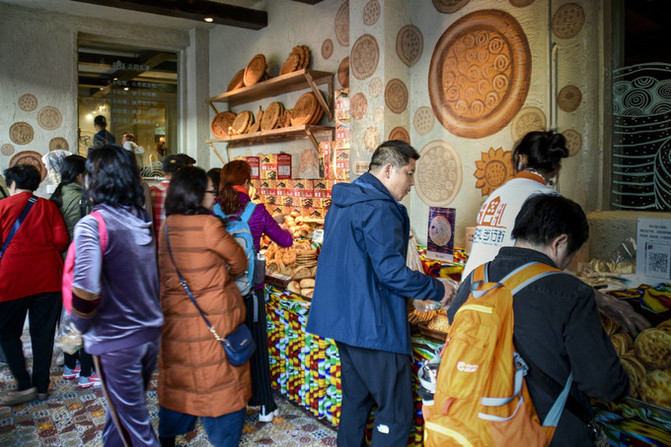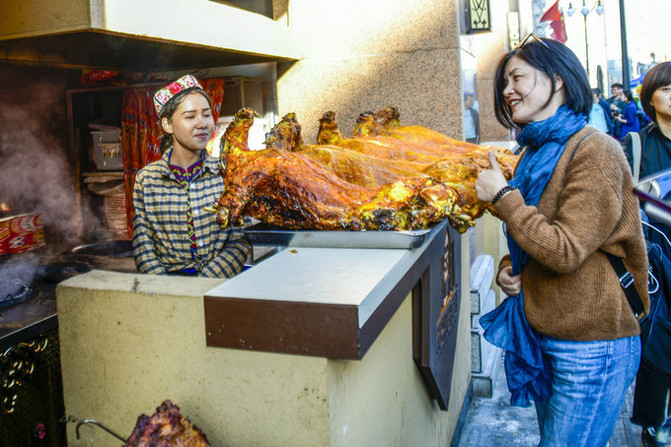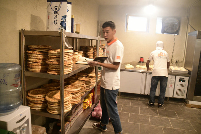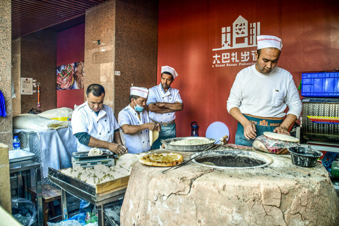 一定要逛逛那个卖馕的专卖店噢。馕是维吾尔人的主食,在这里店员们展示了馕的制作艺术。这块巨大的“浩荣”品牌的大巴扎馕真就是一件艺术品。