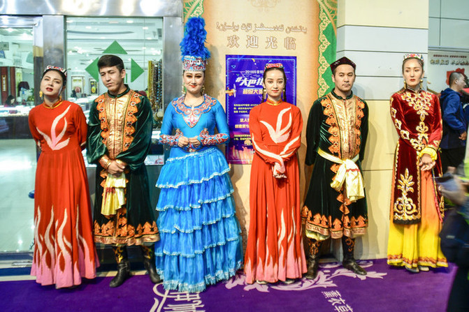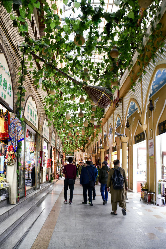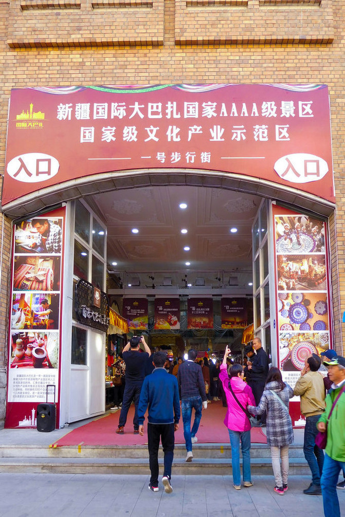 广场的两侧就是丝绸之路 是世界规模最大的大巴扎商场,商场的内部被分成了多了片区,每个片区对应不同的商品类别,也有餐厅和演艺中心,晚上的时候有个什么歌舞表演的,景区内有很多的宣传。