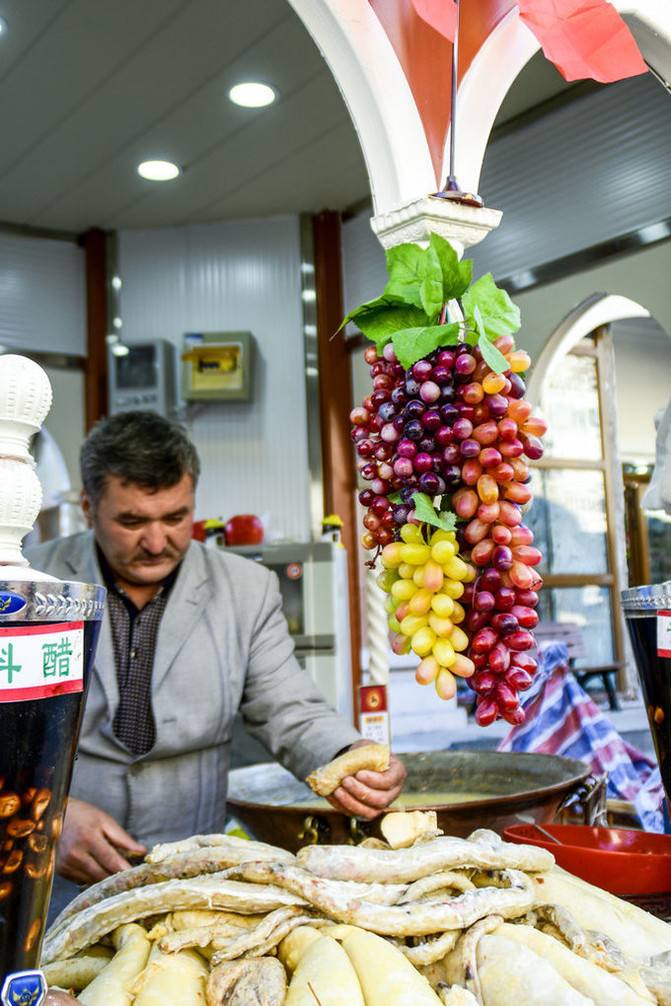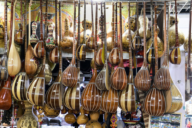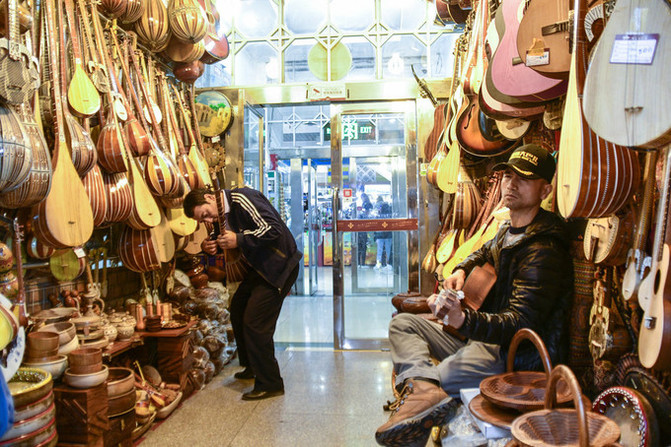 维族的民族乐器,图塔尔、热瓦普(音译,就是天山上的来客中弹的)、还有手鼓等等,有心买的话可以让卖东西的小伙给你弹奏一曲,非常新疆的感觉,当然也有些小提琴之类的西洋乐器。