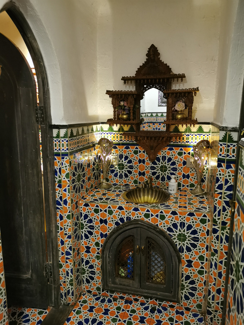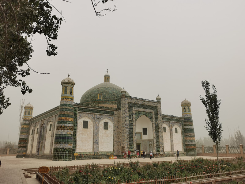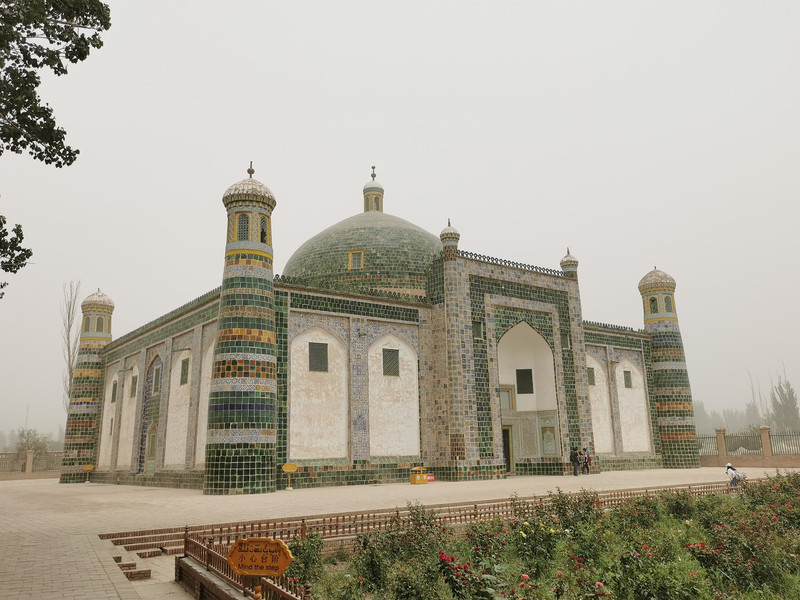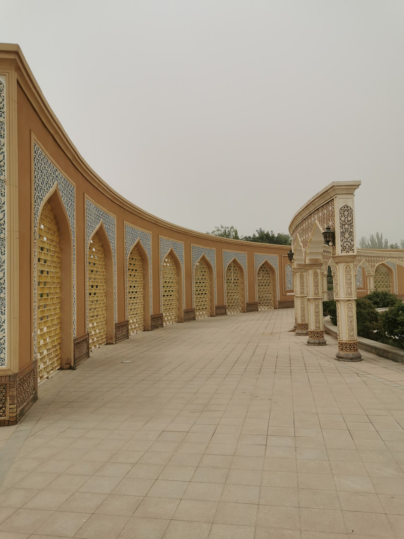 打了个车,去到了香妃墓,我们来参观一下这位乾隆朝最具传奇色彩的的妃子的坟茔。在门外,修建了一个比较大的旅客集散中心,里面有解暑的茶水免费供应。不知道是不是来的时候是淡季,还是我们来的时候正是午休时间,人不适特别多。门票70元,10人一下的导游费用是60元。导游全部出去了我们需要等待一下,不一会儿,导游就回来了。一位穿着维族特色的衣服的姐姐,五官很突出,很具有维族的特色,她一路带着我们游览了整个香妃墓。在这里,我们还能了解到维族人民的殡葬方式。
