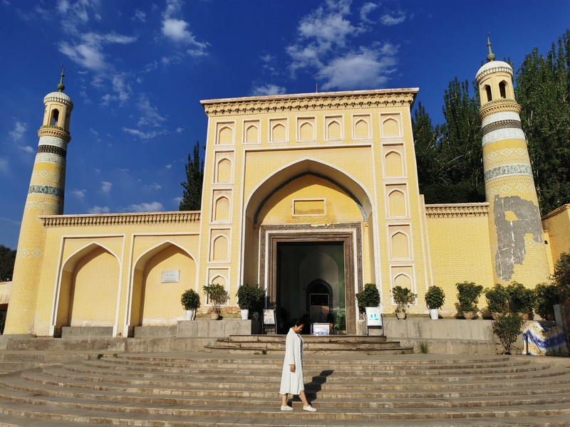 艾提尕尔清真寺是全国规模最大的清真寺之一,正门是鹅黄色的建筑,旁边是两座宣礼塔,弧形的造型柔和静美,寺门上挂着巨大的写有阿拉伯文清真言的牌匾。