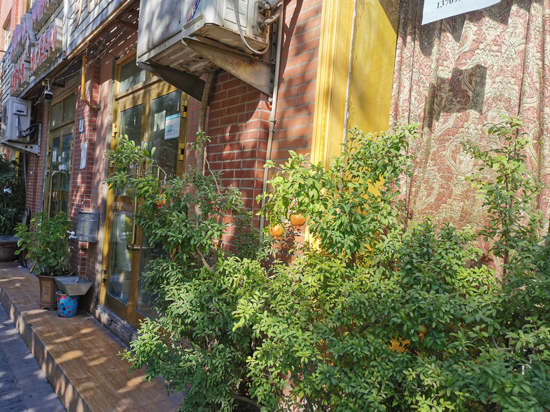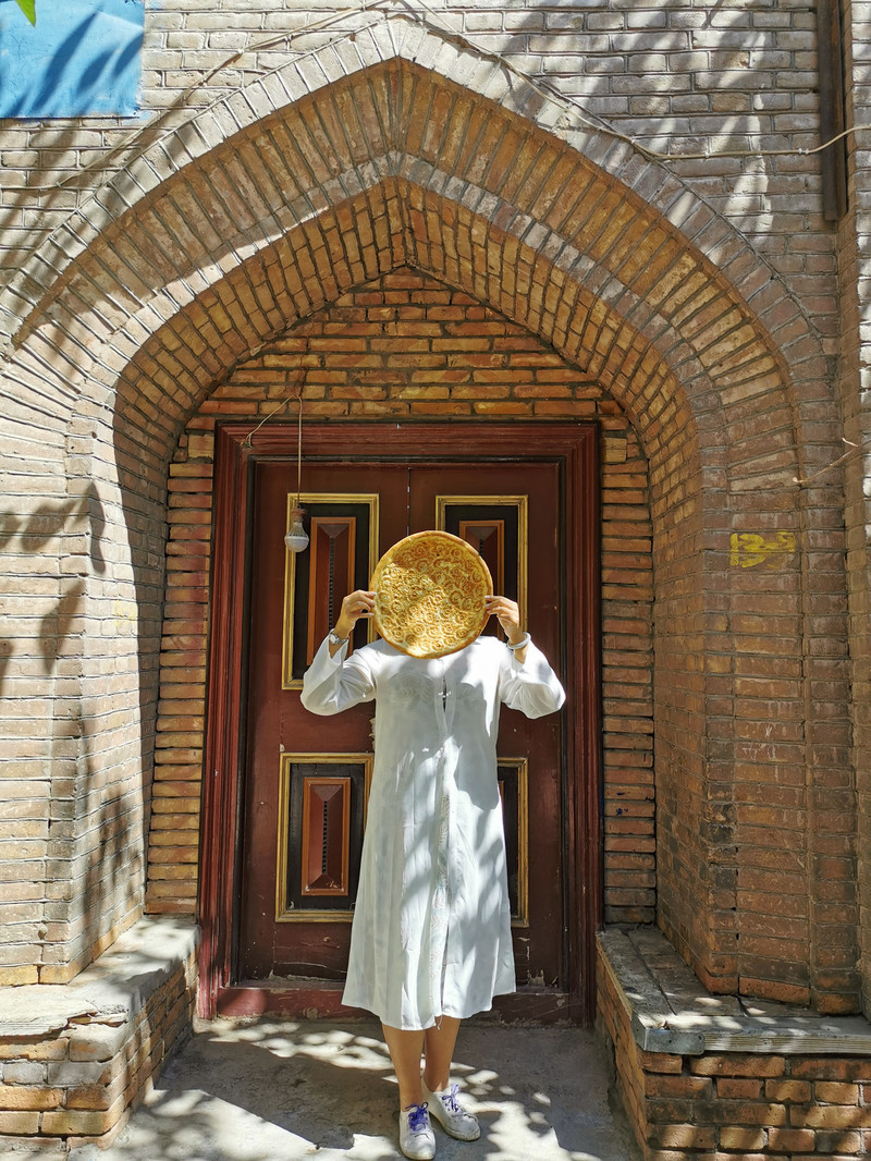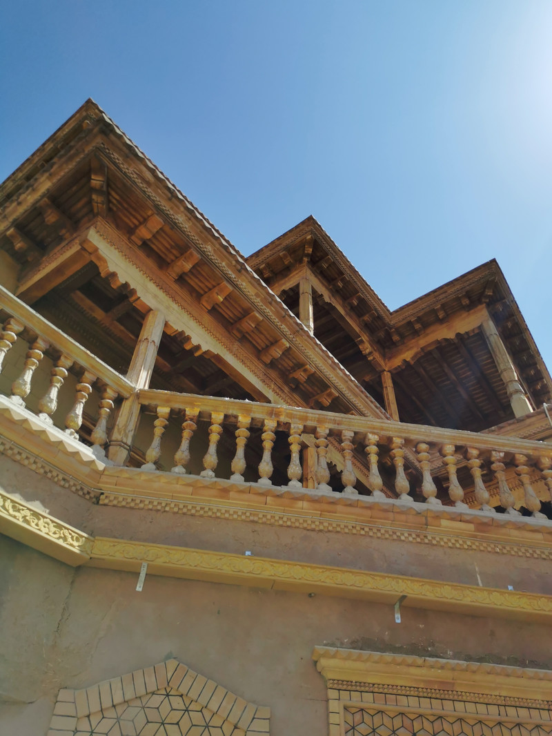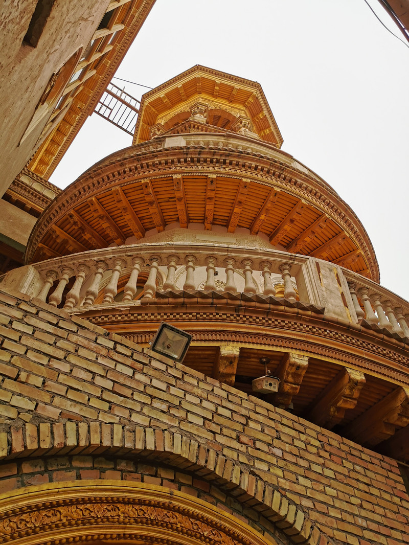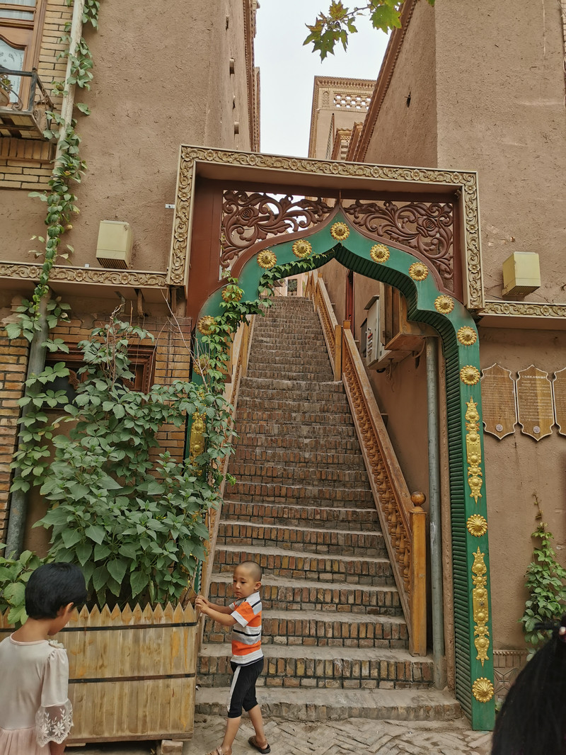 从正门出去,斜对面应该就是高台民居了。听说高台民居是疏勒地区古老的民居形式,有点类似于重庆山城上的房屋。因为它是建立在黄土高崖之上,民居依山而建,室内外空间布置不受对称等概念的束缚,充分利用地形和空间,错落有致。后来又出现了巧妙的“过街楼”,从二楼跨街过巷搭过对面,既不影响楼下行人行走,也不影响楼上人居住。但是,我们似乎打开的方式有点不大对,到了入口处,这里已经被铁门封死了,无法进入。问了路人,他们似乎也找不到路,最后我们也只有放弃了。