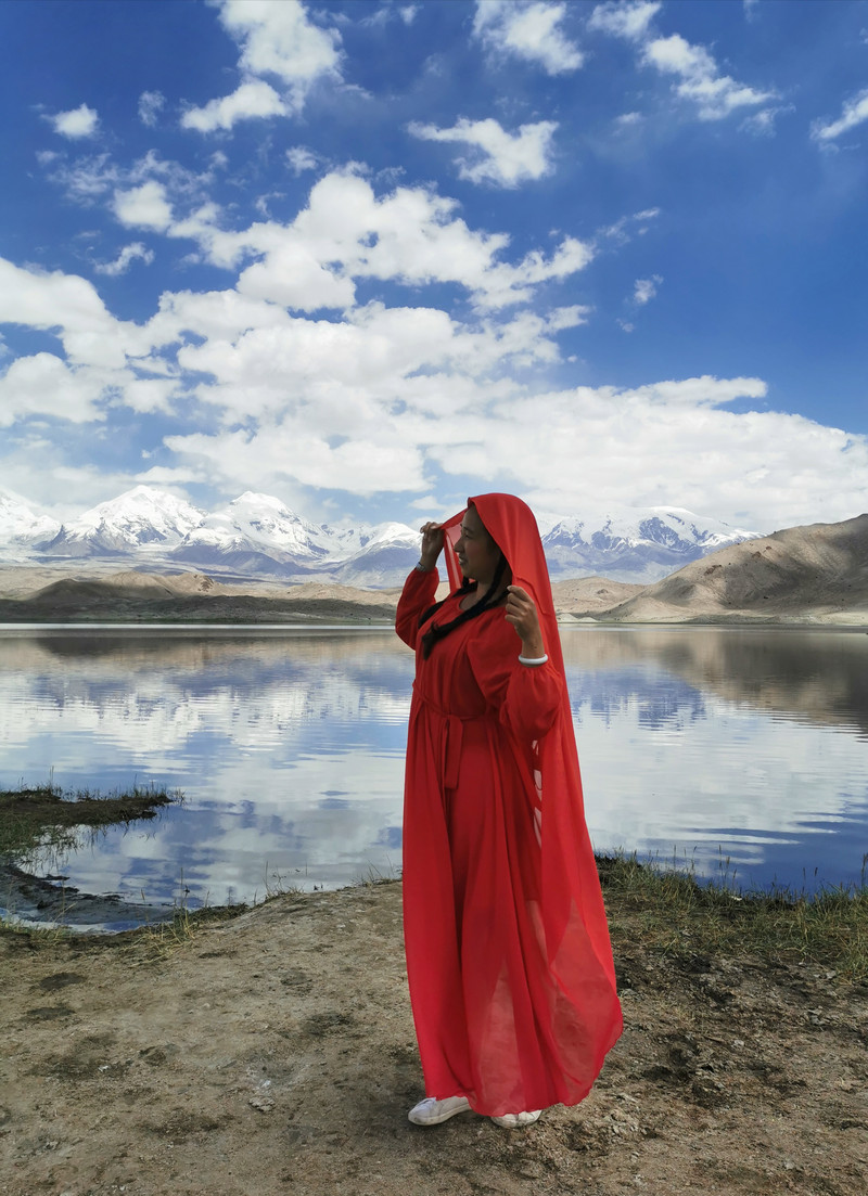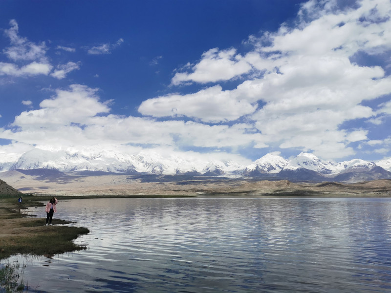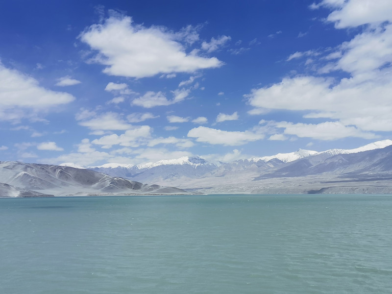 为了节省时间,半小时后我们就离开这个中国最西的邮政局,再行车半小时左右,就来到了今天的第一个景点白沙山、流沙河。山我们也许不熟悉,但这河我们是如雷贯耳的。对的,这就是沙和尚的老家。来到了这里,天气已经和喀什城中完全不同,蓝天白云映照这雪白的沙山,绵延数十公里,再倒影在水中,演绎着柔和和刚健的和谐之美。这时候,导游姐姐跟我们介绍,这里是喀什西部布仑口河和木吉河交汇处,地势平坦、河面宽敞,使得大量河沙堆积,行程了一道沙一道河,层层叠叠,蜿蜒流淌,这是真正的“流沙河”。常年大风向西北吹,将细沙吹到西面的山峦,形成沙爬山的奇景。