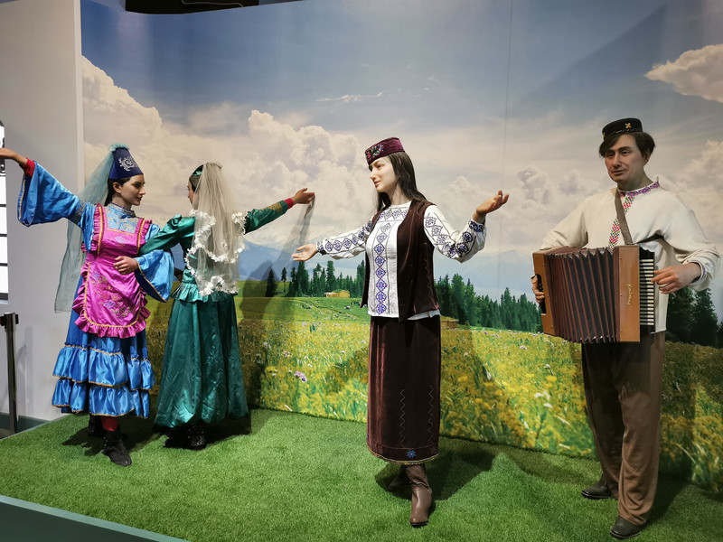 然后再下来走到民族风情陈列展览馆,在这里我们还遇到了上岗的小小讲解员,为我们完整的介绍了新疆各民族的情况。小朋友在大家的围观中,依然有条有理地为我们讲解着各个名族地风情,可见他们地训练有素。经过小小讲解员地讲解,还真的打破了我对新疆地固有观念。我们一直一位新疆是维吾尔族地天下,没想到新疆地不同地方居然有不同地民族在此聚居。不但有维吾尔族、满族、哈萨克族、回族、蒙古族这些我们熟悉地民族,还有柯尔克孜、蒙古、锡伯、塔吉克、乌孜别克、达斡尔、塔塔尔、俄罗斯等多个民族。认真地听完讲解,发现已经是1点多了。