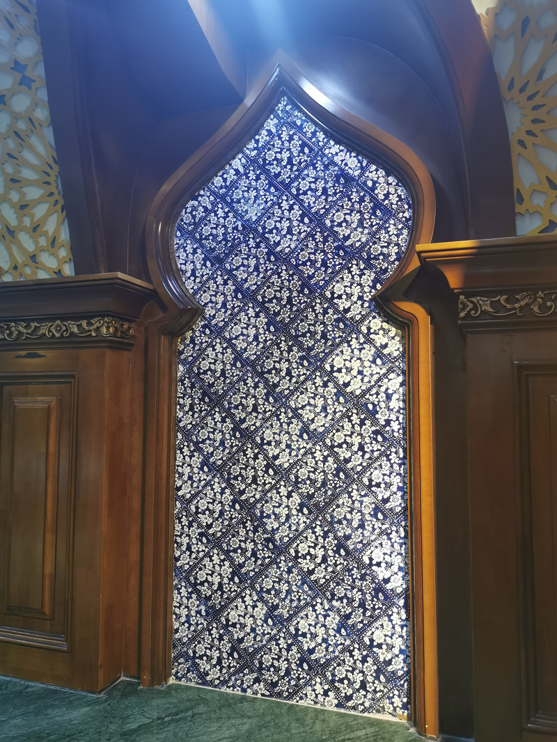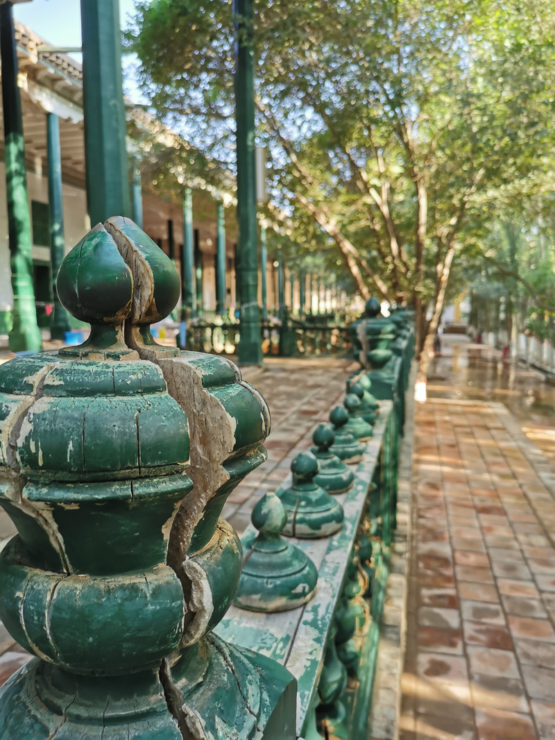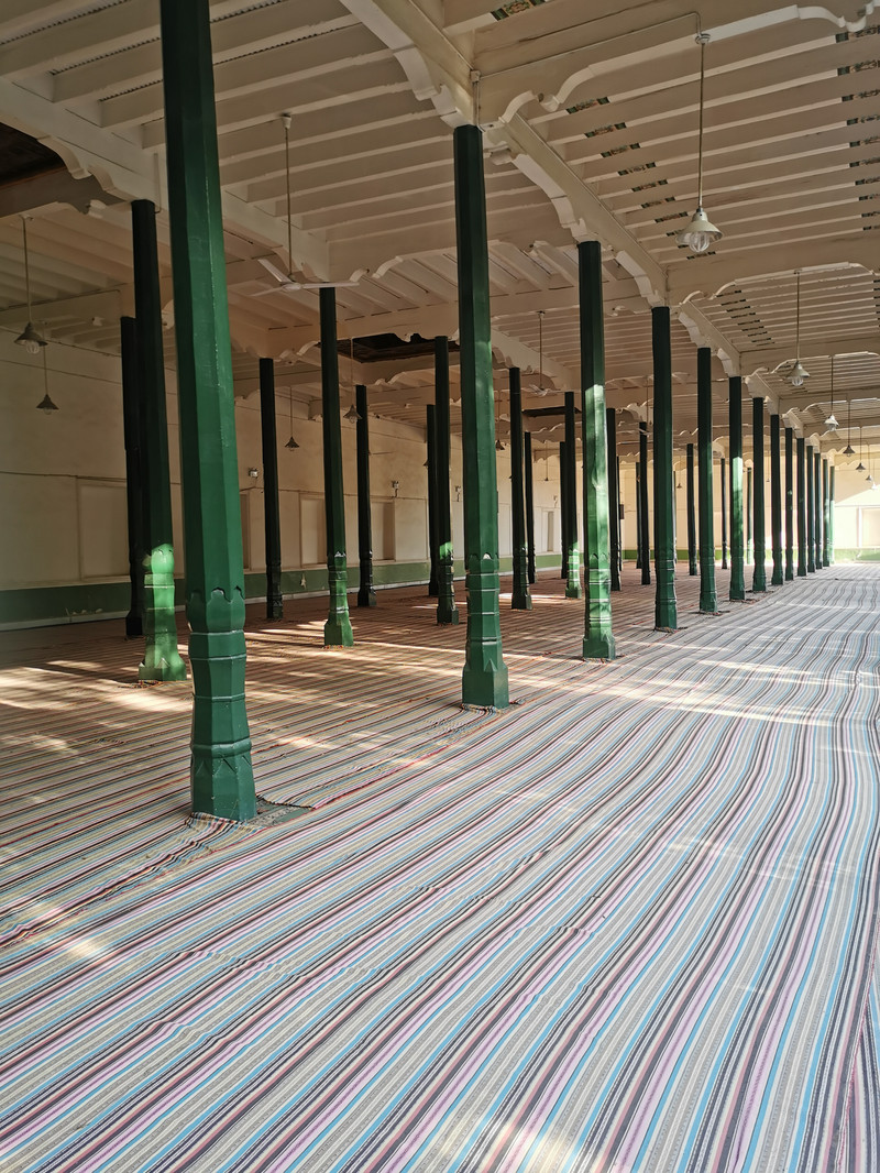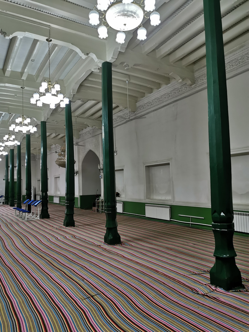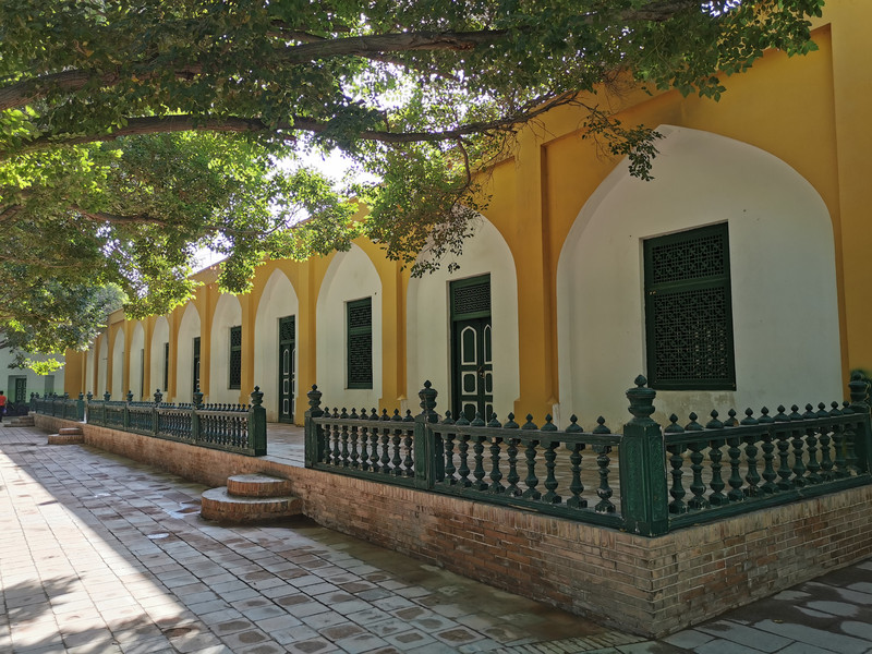 院内有礼拜堂、讲经堂、拱北孜等十几座建筑,以绿色为主色,每一座都很有伊斯兰风情。最为重要的参观地点是礼拜堂,位于寺内最深处,礼拜堂长有一百多米,以绿色为主色,有一百多根七米高的绿色大柱支撑,里面一排排的坐垫便是穆斯林们礼拜的场所了。