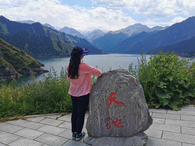 我们没有坐公共交通工具,在小环线包车的时候已经算上了这一天,因此司机师傅一早就来接我们前往天池。从乌鲁木齐城市到天池景区有2.5小时的路程,停车场下车后根据指引就到了售票处,依然是要分门票和交通车票来买,但必须两个都买,因为用脚走上景区是不现实的。交通车的调度还是挺不错的,散客和旅行团并不是一条线,散客很快就可以上车了。沿途有导游为你介绍景色,在民族村有体验项目,必须要下车,走过民族村才能够再次上车,不能从停车场直接绕过去,导游解释是安全问题(其实大家都懂的啊!)当然他不会强制你体验项目的,我们直接走过民俗村,走到另一边的停车场,再次上车,就能上到天池了。停车场下车,大概还要走20分钟的路程才能看到真正的天池。过程中可以坐电瓶车,不过天山空气不错,年轻人走走没关系的。