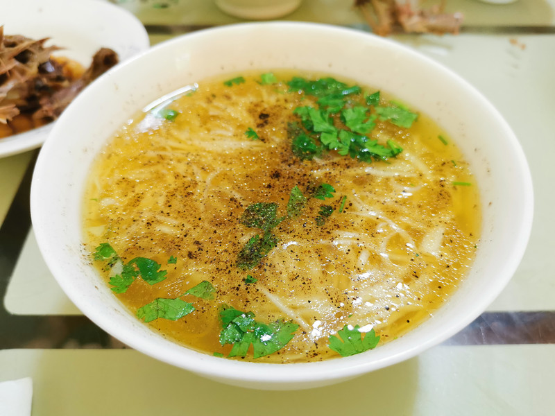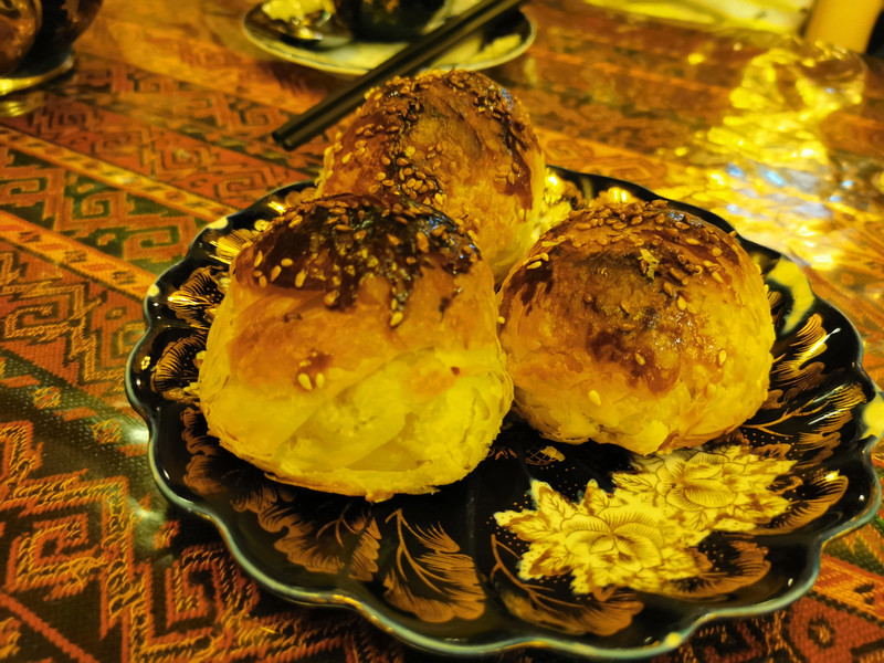 跑到其他地几个展馆转一圈,大家已经饿得头昏眼花了。于是放弃了到大巴扎吃东西地打算,我们在博物馆附近找了个羊杂汤来吃。羊杂还是很膻地,他们很加上大葱生姜等调料去膻味,如果能吃内脏的不妨一试噢!但新疆地面食的馕真的是非常地不错。