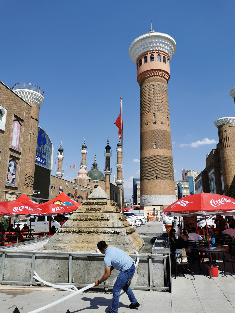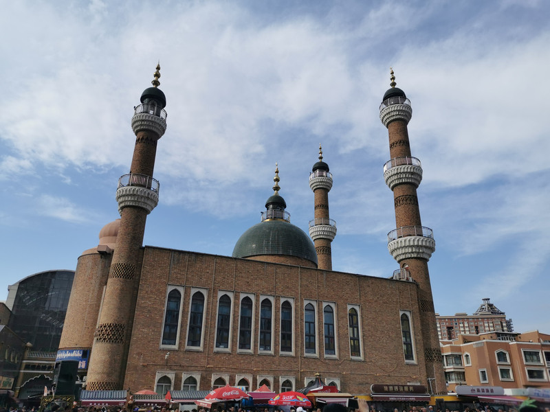 吃完饭后坐921、51、311等公交车就可以到新疆国际大巴扎了。大巴扎就是市场的意思,新疆乌鲁木齐的国际大巴扎是比较大的一个大巴扎。原来它是乌鲁木齐地区比较大的清真寺,之后发展旅游经济把这里改造成了大巴扎。建筑还保留着当时清真寺的主体建筑,外面一个大广场,大家能够很随意的就跳起来。