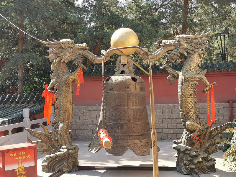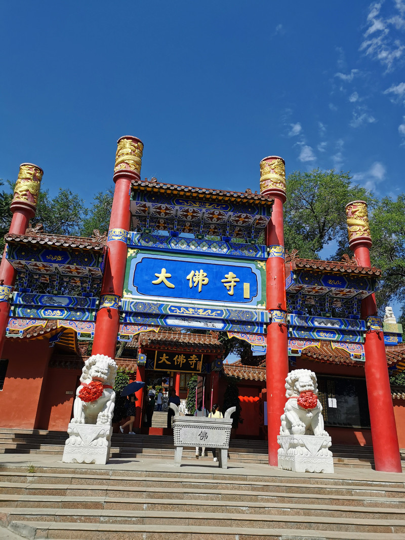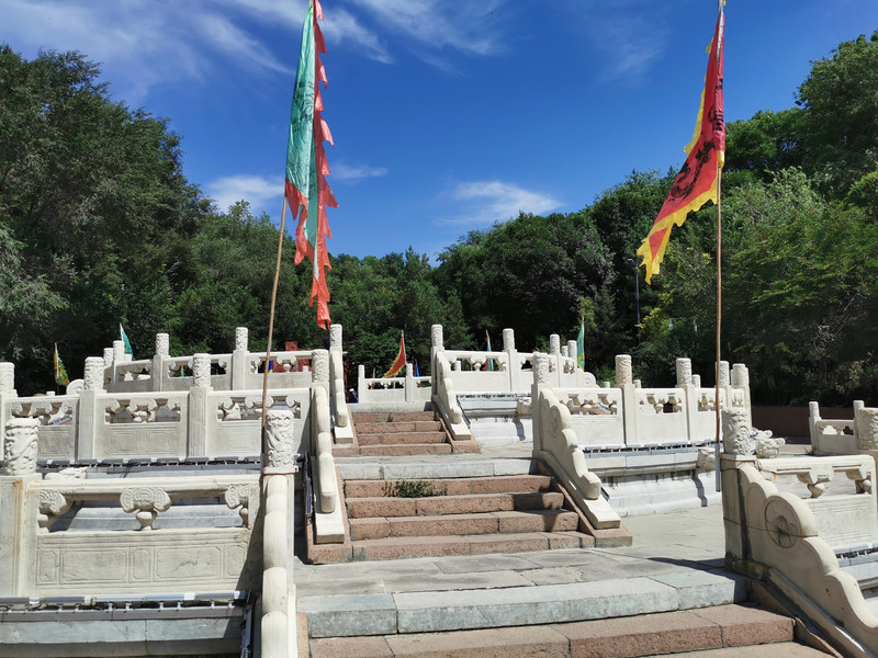 我们绕着天池走了1/4左右,看到天上居然出现了日光,天开始炎热。抬头望去,天上灰蒙蒙的云正在慢慢的散开,在看向天池,竟然有了一点点泛蓝。我们有点期待了。在路边补充了一点能量,我们又向前走了一段,走到了一个庙下面,楼梯很高,勇敢的我们爬了上去,发现拦路要收50元门票了。感觉有点坑,收门票干嘛不在下面说啊!坐在道边休息,我们终究是没有进去。这是向下看看天池,天上的云已经完全散开了,蓝天倒影在了湖面,湖水泛蓝,白云倒影在湖面。因为在高山上的湖,感觉离天特别的近。