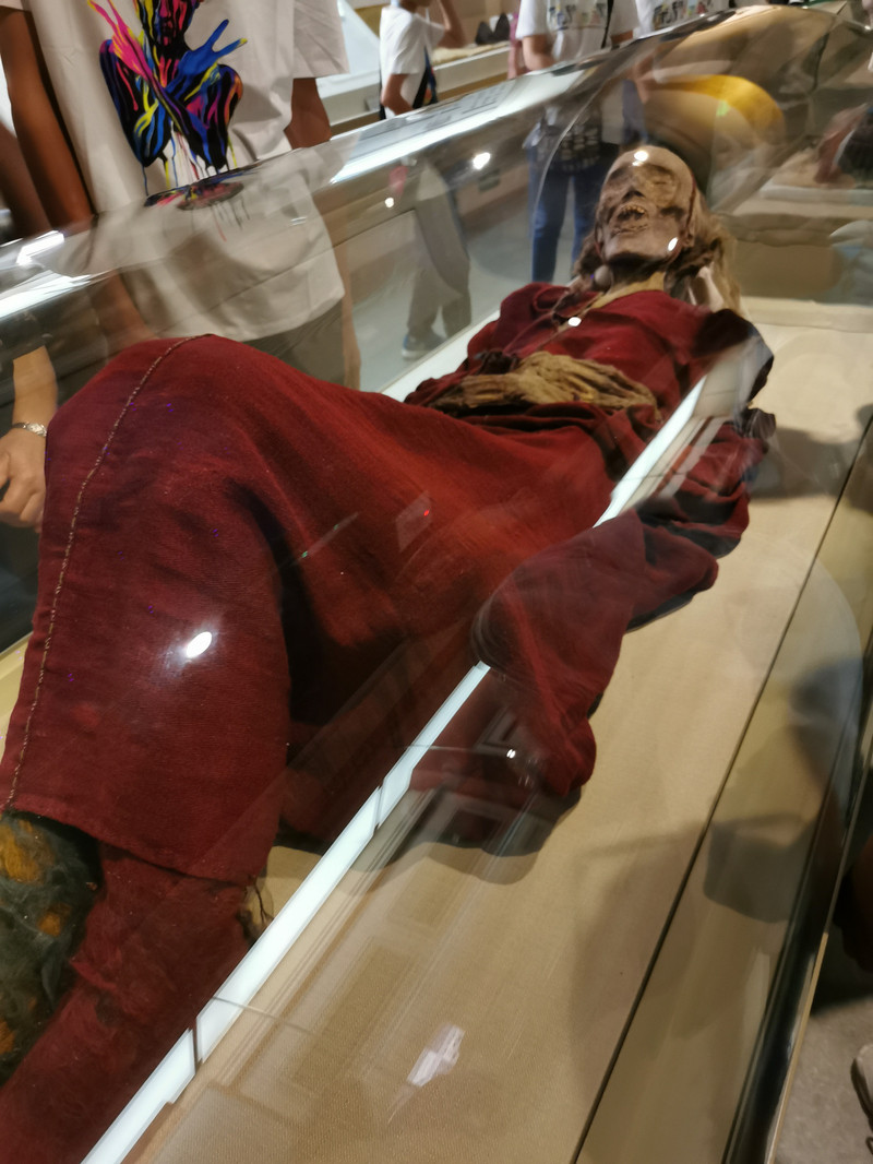 看完了历史陈列展馆,我们转身就上到2楼的古代干尸展览馆去了。新疆的干尸和埃及的木乃伊不一样,它是自然干尸。也就是不经任何的制作过程,只是因为新疆地区干燥的气候,使得人们埋葬在地下的尸体失水风干,而形成的干尸。在这个地方,我们比较完整的观看了在罗布泊的楼兰居民、小河—埋葬千口棺材的墓地、戴金额面具的营盘人、扎滚鲁克的彩绘面人、精绝国夫妻情、阿斯塔那地宫的主人、阿勒泰石人石棺发掘出来的干尸。也了解到西域葬仪的特点。各种干尸虽然说不上栩栩如生吧,也是各具情态啦。