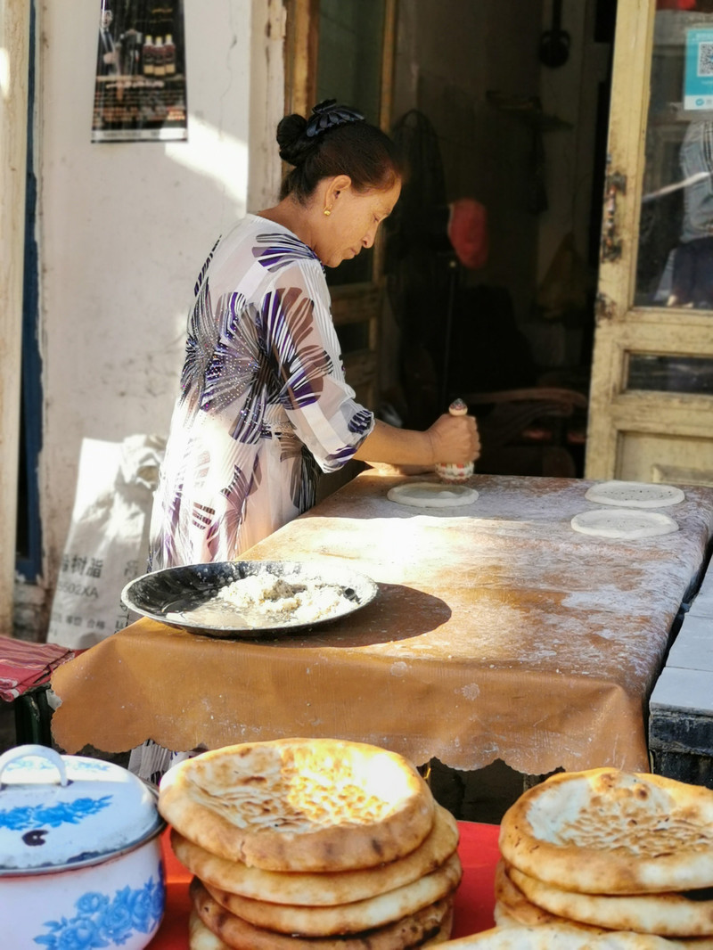 回来的时候我们还是经由古城回来,在路上看到有卖大号馕的,这是一个比脸大的馕。我们买了一个,跟自己的脸比了一下,果然我的脸比较小。