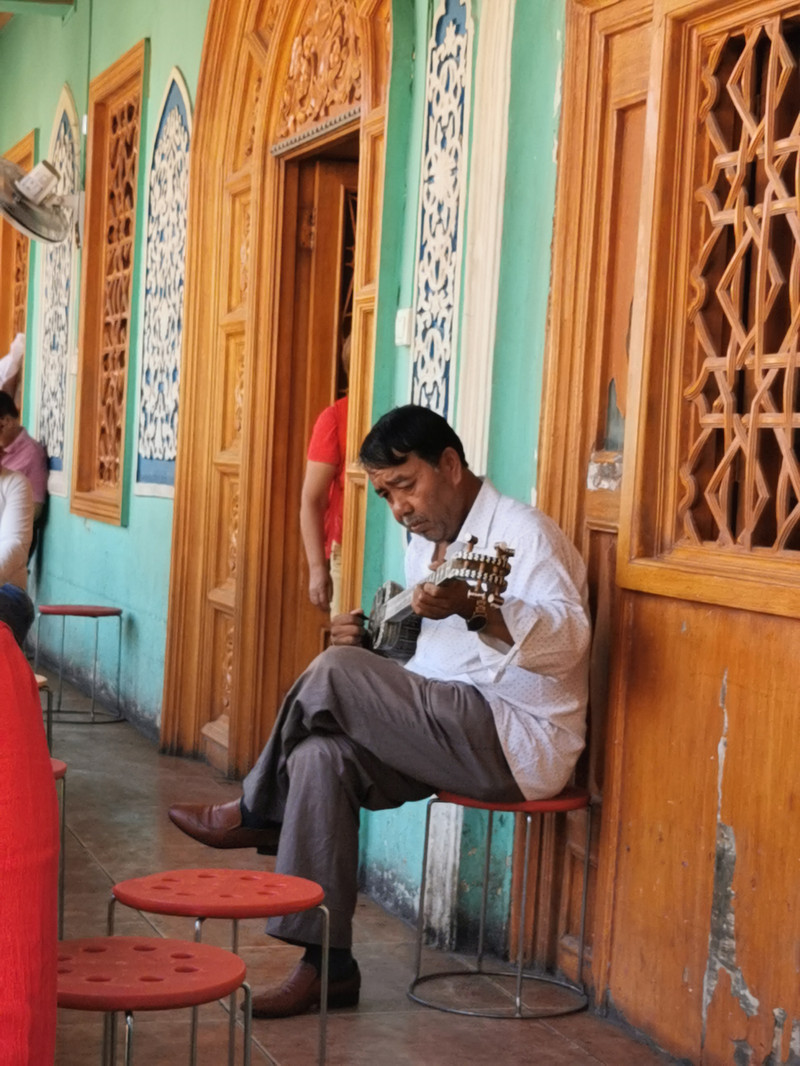 旁边有个小孩子刚买了一个维族的乐器,正在试弹,弹着弹着,旁边就有维族的男子突然跳起了舞,人越聚越多,有几个人拿起了乐器加入了弹奏。跳舞的人也手舞足蹈的邀请着别人的加入。在这个茶馆骑楼狭小的空间里,举行着一场小型的舞会。看到这里我们也总算是了解了新疆人为什么能歌善舞了,而且急促的音乐很容易的让人陷入其中,跟随着音乐的节奏,在场所有人的身体都有节奏的律动着。享受了这场充满民族特色的听觉和视觉盛宴,我们也吃得差不多了,于是带着有节奏的脚步离开了老茶馆。