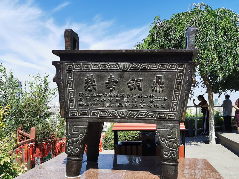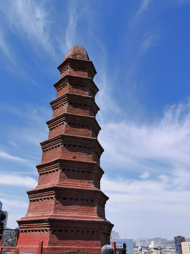 人们在这里建立了红山塔,塔高10.6米,这是一个青砖实心塔,有六面九级。始建于乾隆53年(1788年),距今已经有200多年历史了,经历过多次地震和风雨的侵袭,至今仍然完好无损,十分难得。在红山塔旁边眺望乌鲁木齐景色,也是相当的不错的。当然红山上还有远眺楼可以看到乌鲁木齐市区的全景,不过需要门票,我们放弃了。
