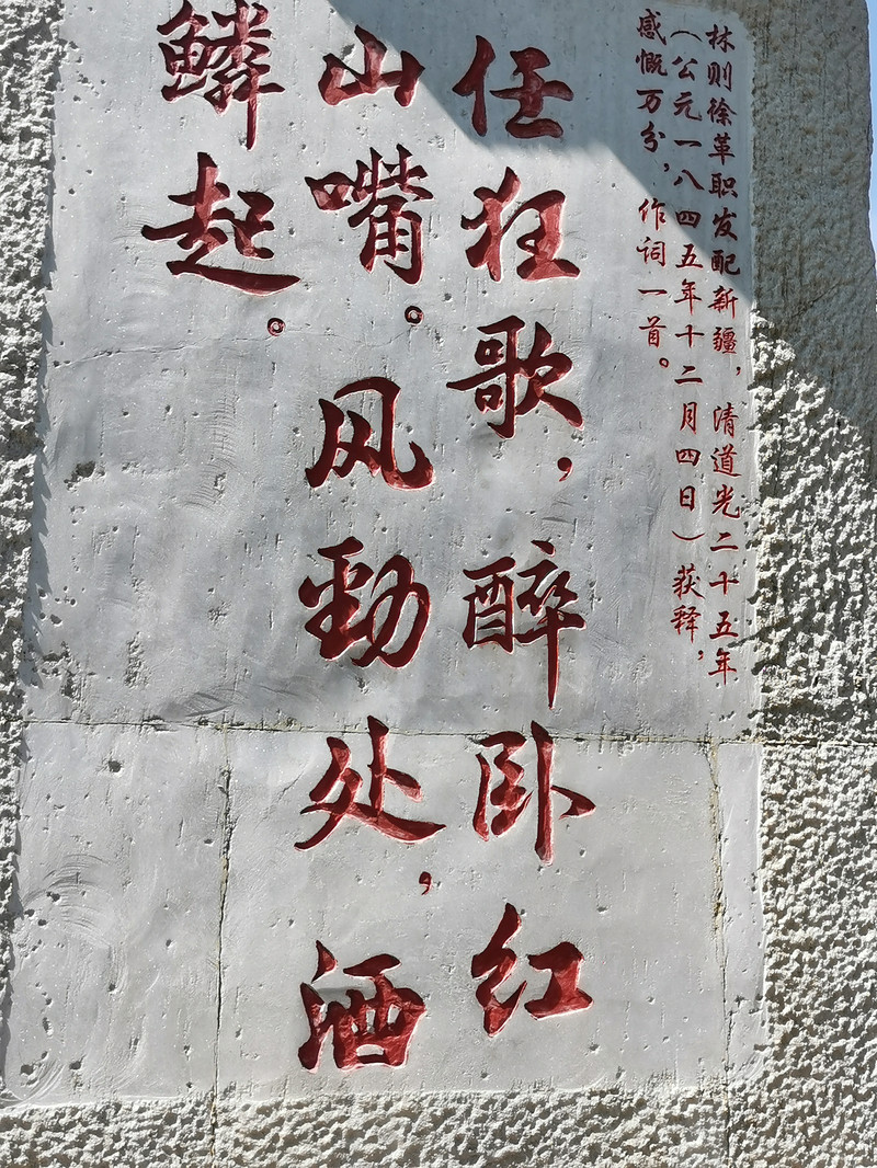 在红山塔下面安放着林则徐的石像,林大人双眉紧蹙,一手背在身后,一手按石,跨步远眺,尽显忧国忧民之态。石像旁刻着林大人登红山时写下的一首诗“任狂歌,醉卧红山嘴,风劲处洒鳞起”。