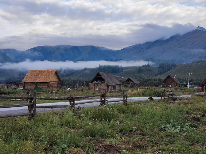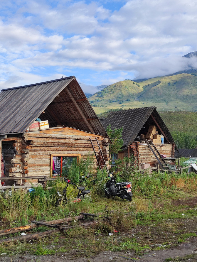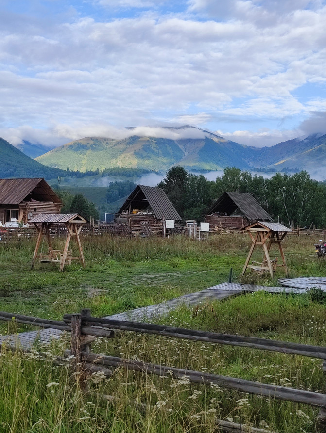 禾木自然、原始的山野风光,风景独特优美,禾木河自东北向西南流淌,原始落村与大草原和谐自然的融为一体。来到禾木村,首先进入我们视野的就是那一栋栋的小木屋和成群结队的牧群,与雪峰、森林、草地、蓝天白云构成了独特的自然与文化景观。这些小木屋已成为图瓦人的标志,现在几乎都拓展为民宿了。