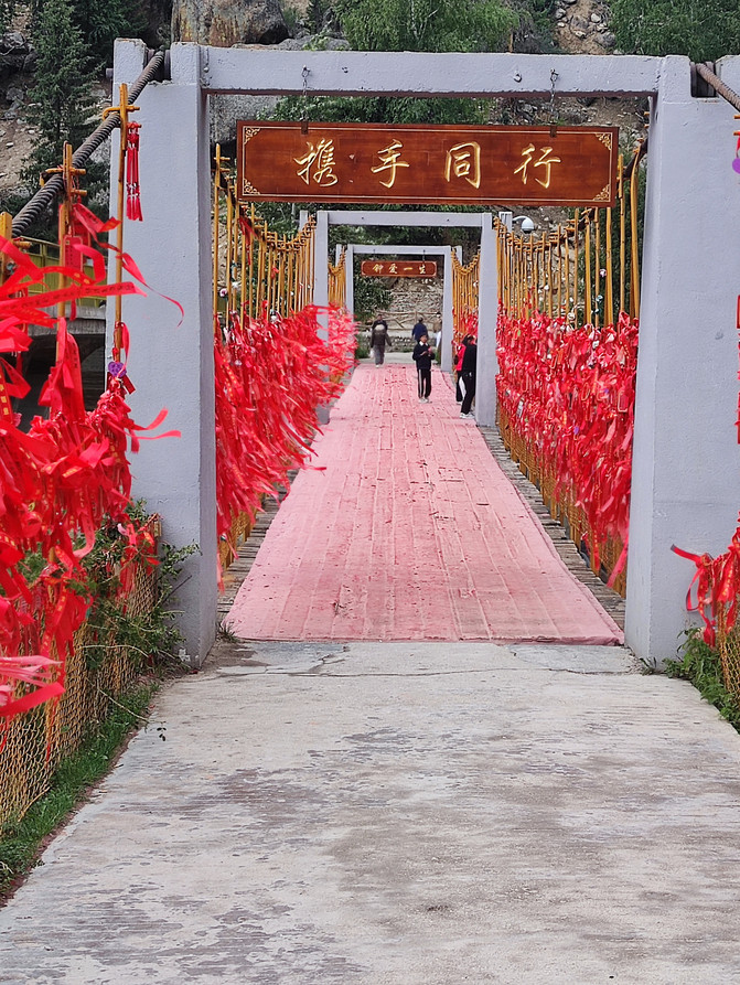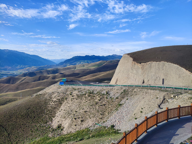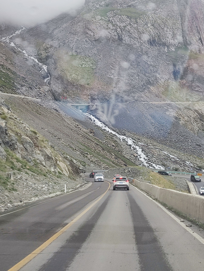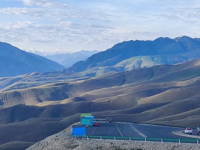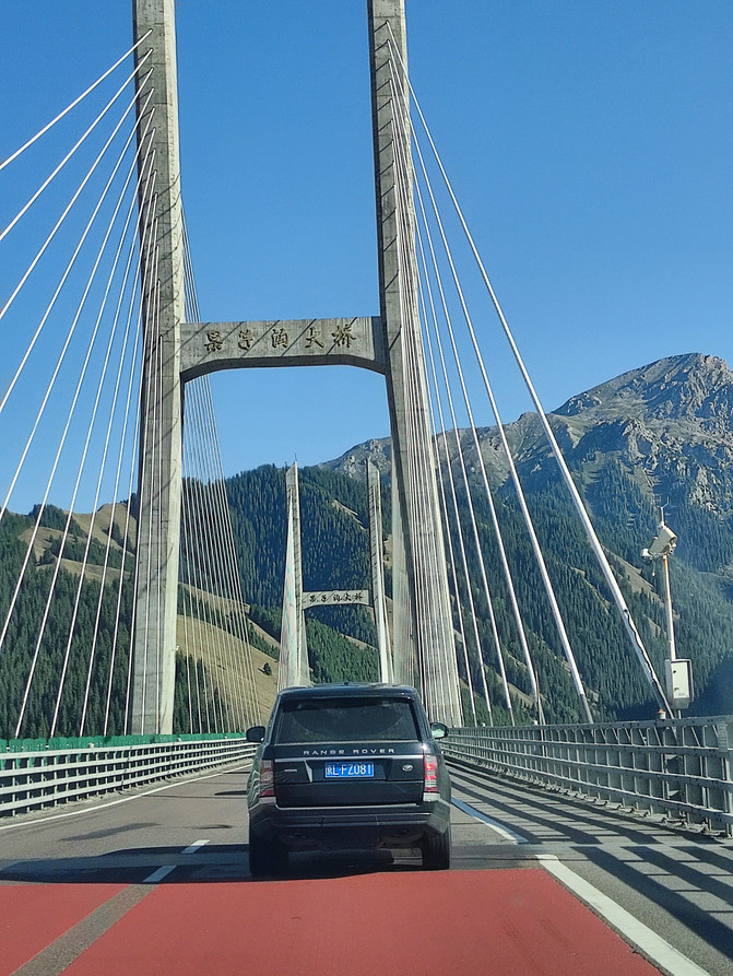 从赛里木湖出来,沿着公路经过果子沟大桥,大桥是自治区公路第一座斜拉桥,也是国内第一座公路双塔双索面钢桁梁斜拉桥。建设者克服气候条件恶劣、有效施工期短、施工场地狭窄等重重困难,在大桥桩基础、主墩承台顺利完成之后攻克了主塔施工的第三道难关,高达209.5米和215.5米的双塔按计划工期顺利封顶。也成为果子沟一道壮丽的风景线。