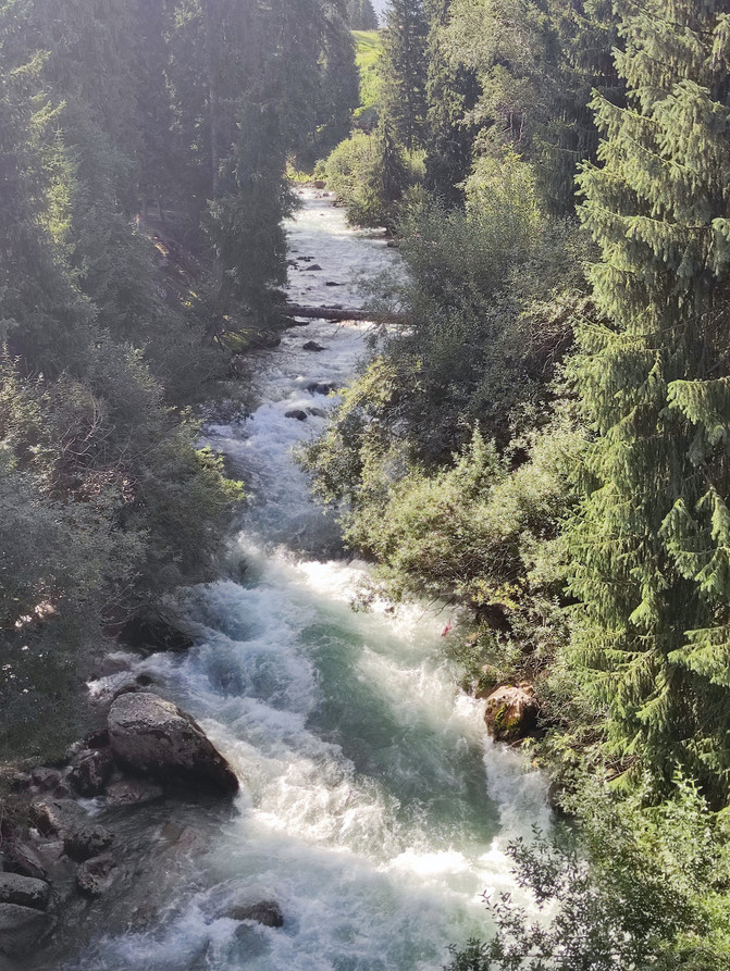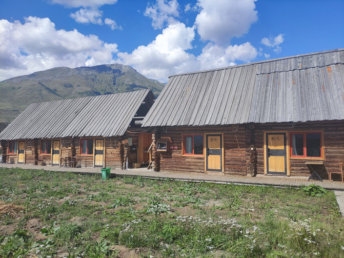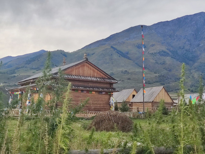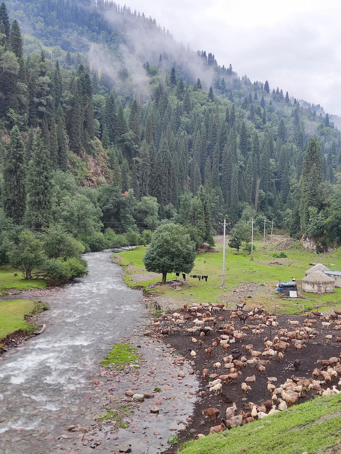 第三天,从特克斯城(八卦城)开车3小时经过弯弯曲曲的山路来到琼库什台历史文化名村,(出村原路返回又是3小时)。它是天山半坡的一个小村,乌孙古道的北入口,村庄四面环山,房屋依水而建,村里人畜饮水及生活用水均来自库尔代河,河谷较宽,常年水流不止。村民利用水力发电解决了用电问题。该村的建筑多为木结构,是伊犁河谷保存完好的一个木构建筑群。琼库什台,在哈萨克语中是“大平台子”的意思。 琼库什台沟壑纵横,在草原中颇具阳刚之美,台地上纵切出无数的沟壑,将平静的草原勾画的像大海里掀起的波浪。不收门票,只是交通不便,都是弯曲的山道。村里几乎都是民宿。据说后山景色非常棒,但需要多住一天才好。
