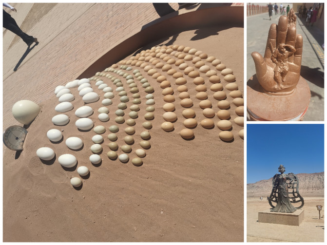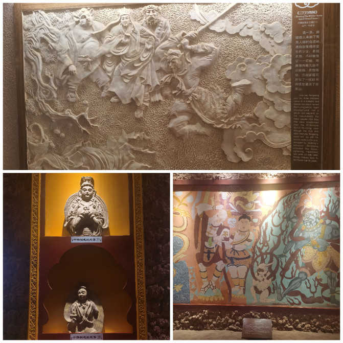 火焰山景区不大,买票后进入,一路下行,然后走地下通道,两侧是西游记壁画。尽头为环岛,是关于火焰山附近的简介,以及附近景区的展示,包括壁画、佛像、雕塑等。参观以后可以出来,观看世界上超大的温度计,并合影,可以免费领小像。之后到地面来看铁扇公主、牛魔王及其他神仙的雕像,也可以品尝沙窝鸡蛋玩沙漠项目。不过火焰山景区地表温度在60℃+,整个参观大概0.5-1小时,建议大家做好防护,只带手机和一瓶水就足够了。