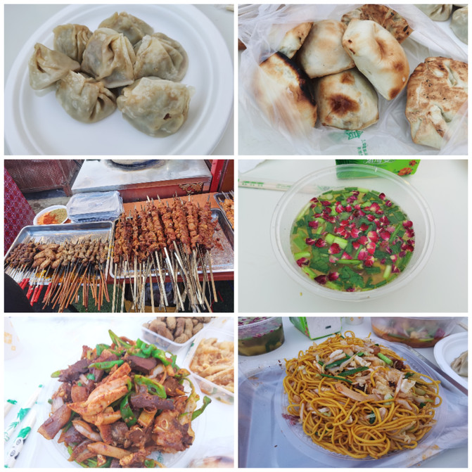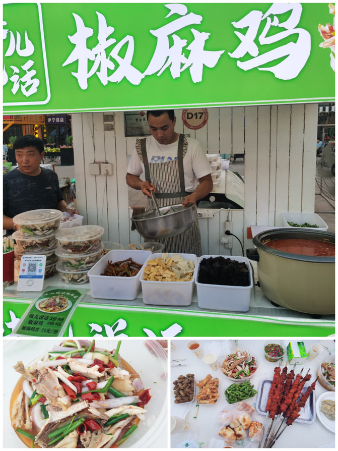 伊宁市最大的美食夜市,有几十家不重样的店铺,100+种特色美食。我们21点左右到的,已经没有什么空位了,椒麻鸡他家后面有实体店,还有大桌,就过去了,顺便点了大份椒麻鸡让他分装盛两份。烤包子和薄皮包子肉馅相同价格相同就是做法不一样,所以每样点了一个品尝,好像大家更喜欢薄皮包子。炒牛杂微辣口,都很嫩,口感很好。炒黄面,感觉像米线那种很筋道,不辣,好吃。烤排骨,超大一串,一串感觉肉量就超标了,20一串,超值。玫瑰鸡汤,清汤,微甜,暖暖的,喝着很舒服。酒水不用自己着急点,会有人推着车过来,我们选了红乌苏和卡瓦斯。这次的卡瓦斯是袋装的,感觉啤酒味儿更淡,口感更甜,女士们很喜欢。
