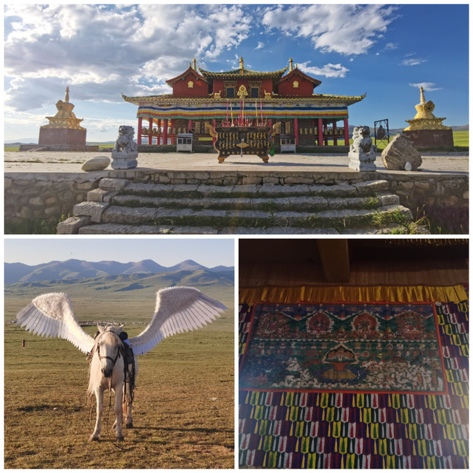 然后坐车前往第二站巴润寺,很多导游都让直接跳过,但是巴润寺号称是草原上最后一座移动的寺庙,始建于清朝,08年重建,才结束了设在蒙古包里的寺庙随季节搬迁的历史,很值得去看看。于是我们果断下车,这个景点是18点结束参观,所以我们一路小跑。藏传佛教,里面有唐卡壁画,有宗喀巴,外面有转经筒,远处是草原夕阳,时间充裕的小伙伴可以好好拍一拍,有西藏的感觉哟。
