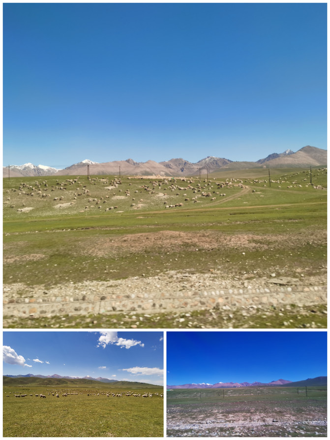 路程320km,车程6小时,一路景色渐次变化,光秃秃沙漠-彩色的土-浅浅的草原-远处的雪山。因为我们是小团,路上看到好看的景色,在安全的情况下可以停车下来休息+拍照,看到了很多牛牛马马羊羊还有花花,很漂亮。