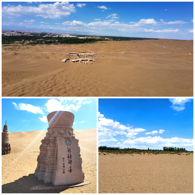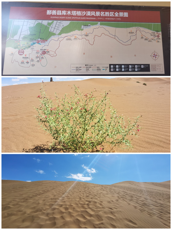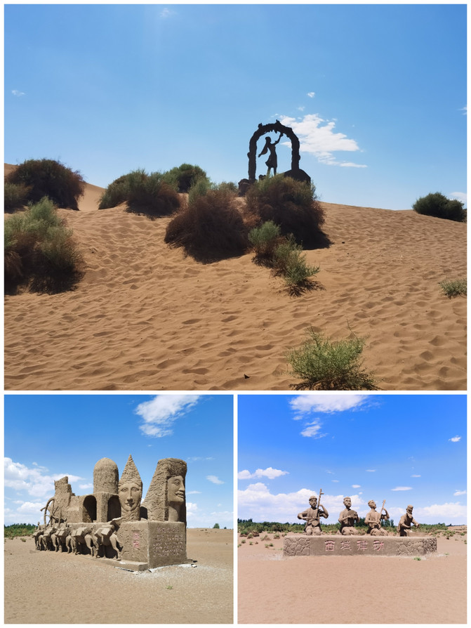 我们到的时候大概3点多,实在是太热了,游玩的性质大减。景区有两趟交通车,常规需要购买线路一:大门-停靠站1-停靠站2-停靠站1-大门。线路二:停靠站2-停靠站3-停靠站2。停靠站1主要是越野车、滑沙、卡丁车、骑骆驼等项目。停靠站2主要是各种沙雕,适合拍照。停靠站3是空中项目。每站都有卫生间,很干净,也有小卖部,可以买一些零食和水。交通车人少时需要人满发车,人多也会及时调度,不用担心。可以组滑沙板和鞋套,建议大家可以提前自己网购沙漠鞋套9.9包邮,就算不玩项目,沙漠里拍照也很方便,结束以后可以拿回去清洗,干的很快,如果短时间内没有其他用处了,也可以直接扔掉,也不算心疼。