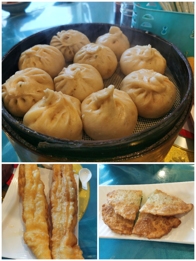 这是一家清真餐厅,早餐种类丰富,直接在前台点餐,我们点了一笼包子,然后油条,韭菜盒子,粥、豆浆两元一碗,自己盛就好。上来的很快,油条一定要趁热吃,很大一根,建议大家每人1-1.5根就足够了。韭菜盒子,稍稍有点油,甜咸正好。包子算是薄皮大馅,味道还不错。