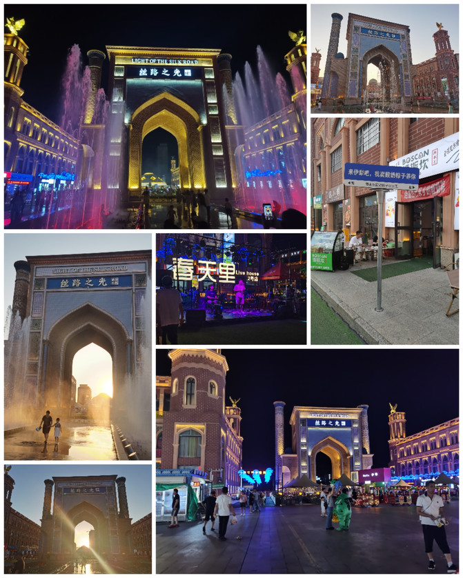 小镇比较大,门口的中亚之门是必打卡景点。过来的时候就一直有音乐喷泉,中间拍照容易被水淋到,一定要注意。右侧安检进入,一路是各种小店铺,可以逛逛。广场左侧有个高空的项目,一直有小哥哥在表演,不恐高的小伙伴可以感受一下吊威亚高空行走的感觉。中间有个毡房,收费参观,可以深入了解哈萨克族,感兴趣的小伙伴可以看看。左侧还有一些儿童游乐设施,右侧是餐饮夜市,规模比较大,同时能容纳很多人。出来的时候发现入口对面都是露天酒吧,晚上有歌手驻唱。