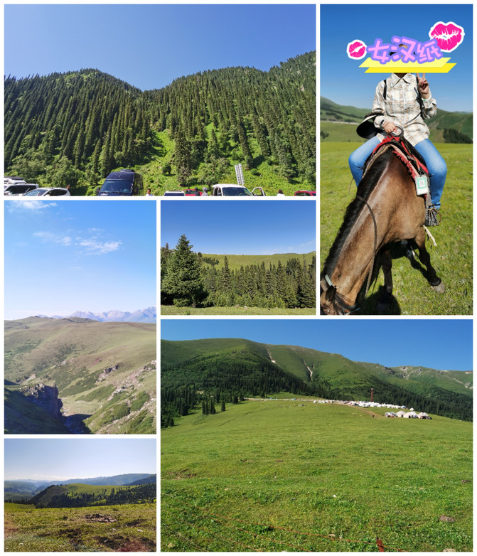出发前往那拉提,路上是独库公路北段,路两侧从草原开始逐渐变成森林树木。因为今天的行程包含骑马,司机小马哥建议我们在景区外找牧民老乡骑马,价格一样,路程要增加一倍,我们骑着更实惠,大家都同意了,于是到了一个路侧休息点,小马哥果断下车区砍价,最终成功。我们六个人一起出发,翻越了几座山头,还有老板家的小朋友带领我们骑顺便帮我们拍照,返程还不走回头路,简直不要太完美。