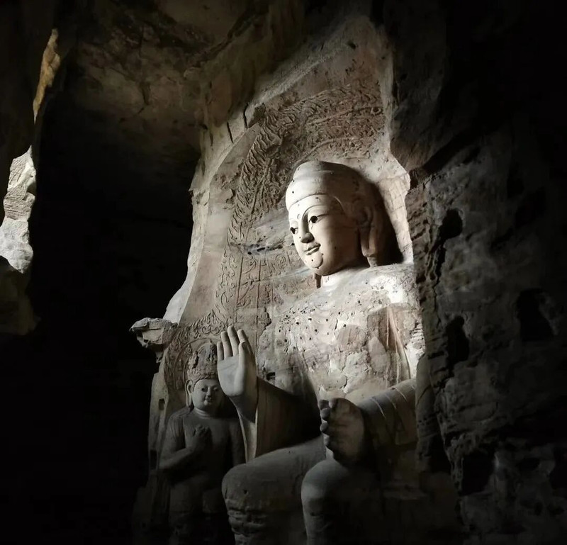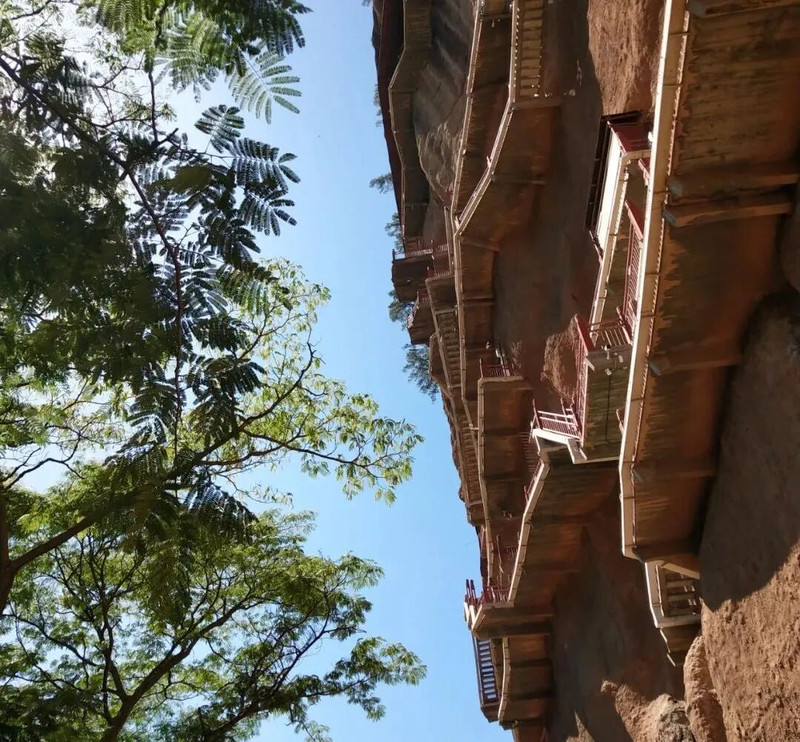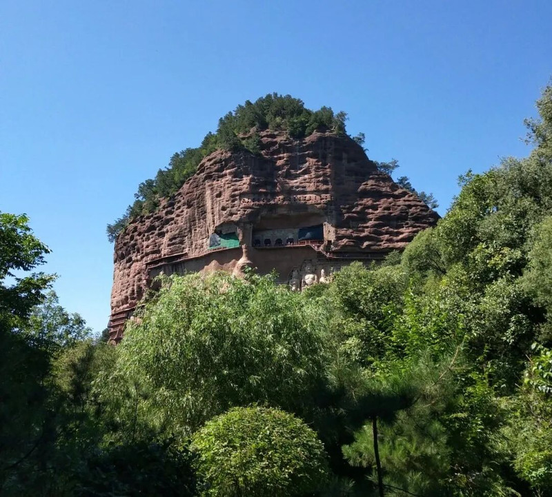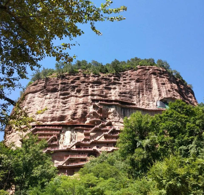 (2)麦积山是小陇山的一座孤峰,高142米,因山形似麦垛而得名。在四大石窟中国,麦积山地位稍弱一些,它和交河故城一样,不是单独的世界文化遗产,而是“丝绸之路:长安-天山廊道的路网”中的一处遗址点。