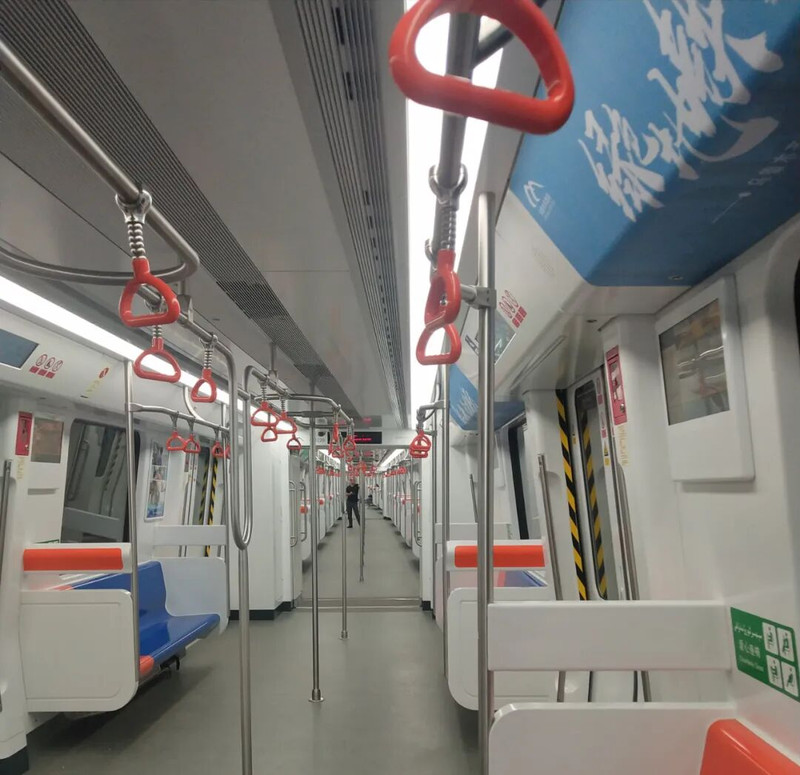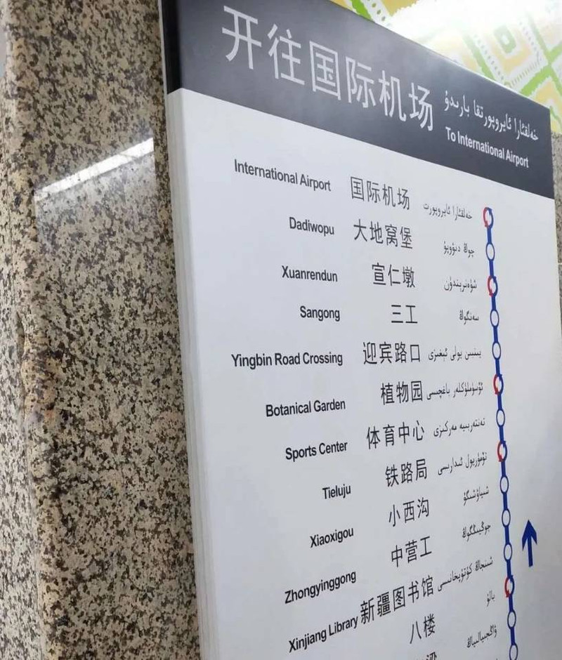 标有汉、英、维吾尔三种文字的地铁指示牌