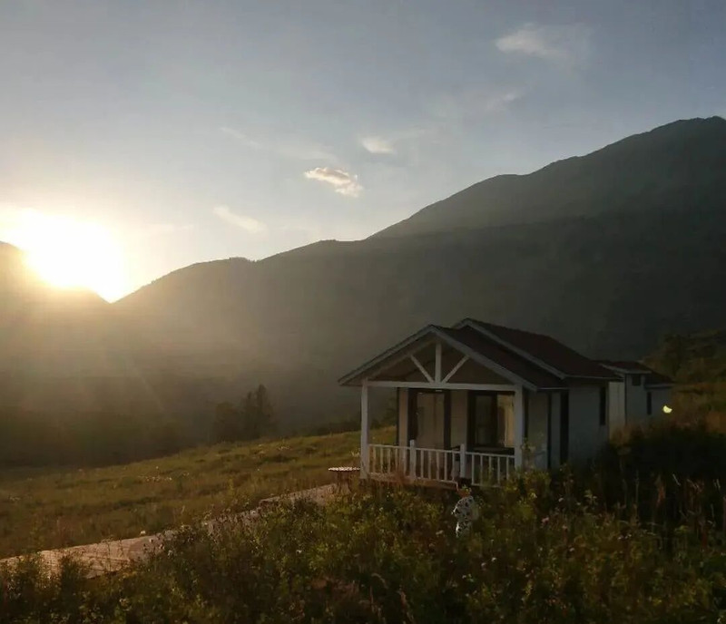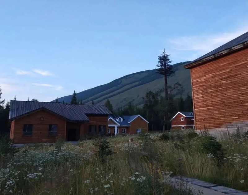 (2)酒店客房都是散落在草丛间的小木屋,通过栈道联通,推开窗户,可见蝴蝶嬉戏,远处是高山和雪岭云杉,纯净的蓝天白云,酒店旁边还分布着如同童话梦境中色彩各异的房子。除了入住客人,这里没有其他游客,周边很安静,置身这样的环境和氛围之中,心情不言而喻。
