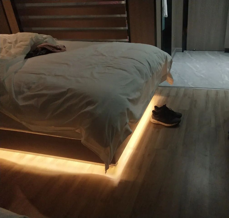 房间亮点很多,暖气片、加湿器、自动窗帘和床底下温馨的氛围灯
