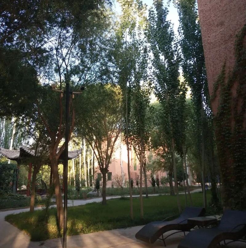 午休后的时光。敦煌不可错过的酒店,公园级别环境。堪称巨大的庄园式布局,树木遮天蔽日,任闲庭信步。