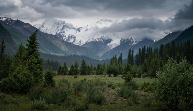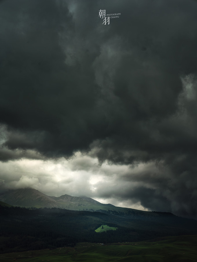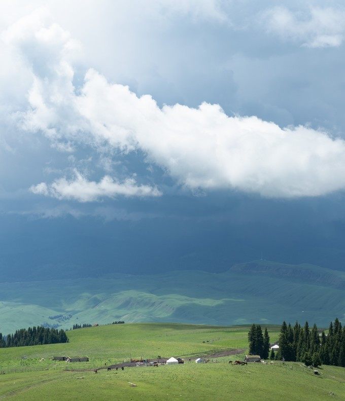 ?此刻,就在不远处的峡谷腹地的琼库什台,乌云密布。我们甚至能清晰看到雨帘是如何落到山顶。以及响彻山谷的雨声,噼里啪啦,非常有趣。