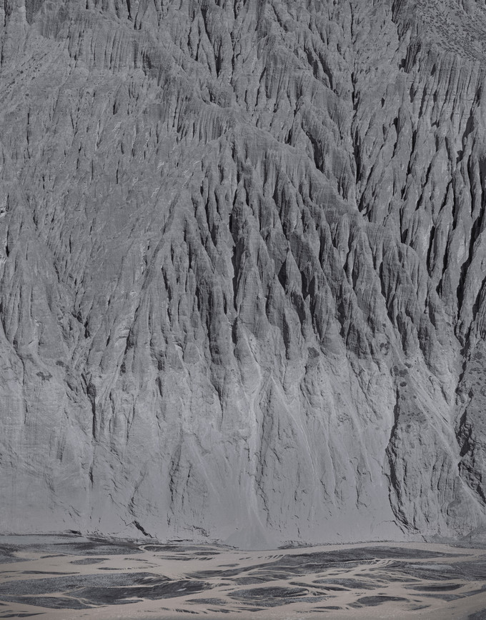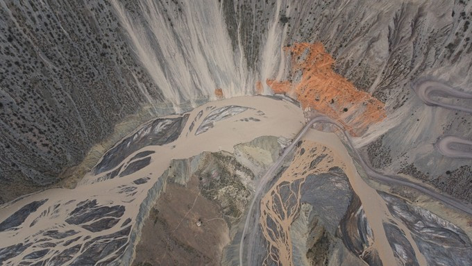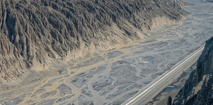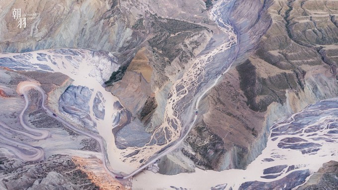 安集海神奇在于,它是从平原上被安集海河切割出来的一道巨大“裂缝”,经过千年的流水作用,形成了长达千米、深达400米的悬崖绝谷。谷底的河流时分时合,不仅勾勒出形状各异的冲积扇,还散出如发丝一样的娟细河道,蜿蜒曲折,十足的国画韵味。不同颜色的砾石、泥岩、红土揉杂在一起,构成五彩斑斓的峡谷剖面。