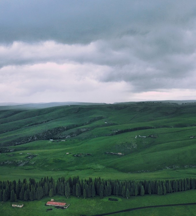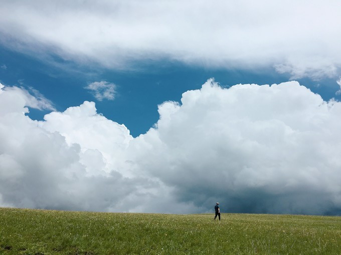 ???????这边的草原起伏更大,与其说是在草原上走,不如说是在山脊间行走。草原和山脊相连,山谷间、山脊上有零星的小木屋。流动的云、扬起的风、荡漾的草地,自顾自地在这天地间生活。视野这样的开阔,目光所及之处,心随时都能飞奔过去。