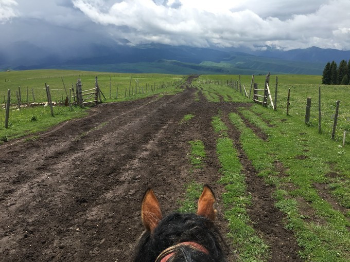 骑马出发时,太阳终于出来了,今天我们从喀拉峻深处的加撒干草原出发。草原的马道和草原一样,一望无际。加撒干草原起伏平缓,马儿走在软乎乎的泥巴里,时不时踩过小水洼。空气中是水汽蒸发和青草晒过的味道,和煦的风吹在两颊。
