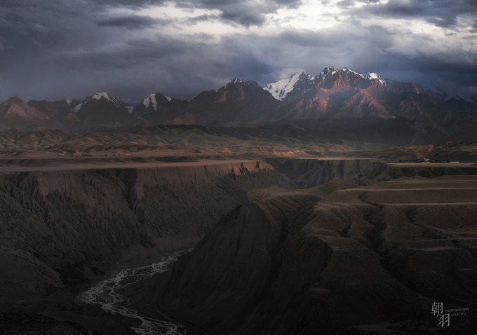 我们在日落时到达,夕阳透过厚厚的云层,映亮了东面的雪山,峡谷阶地的层次丰富起来,一层、两层、三层……十层,甚至更多。
