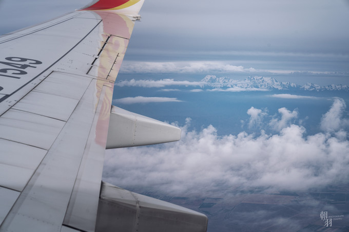 云从地面而起,直上天穹。天山的雪山呈一字型排开,连绵的山势,起伏成无数的空中草原,叠浪般节奏,延展到无法触及的尽头。