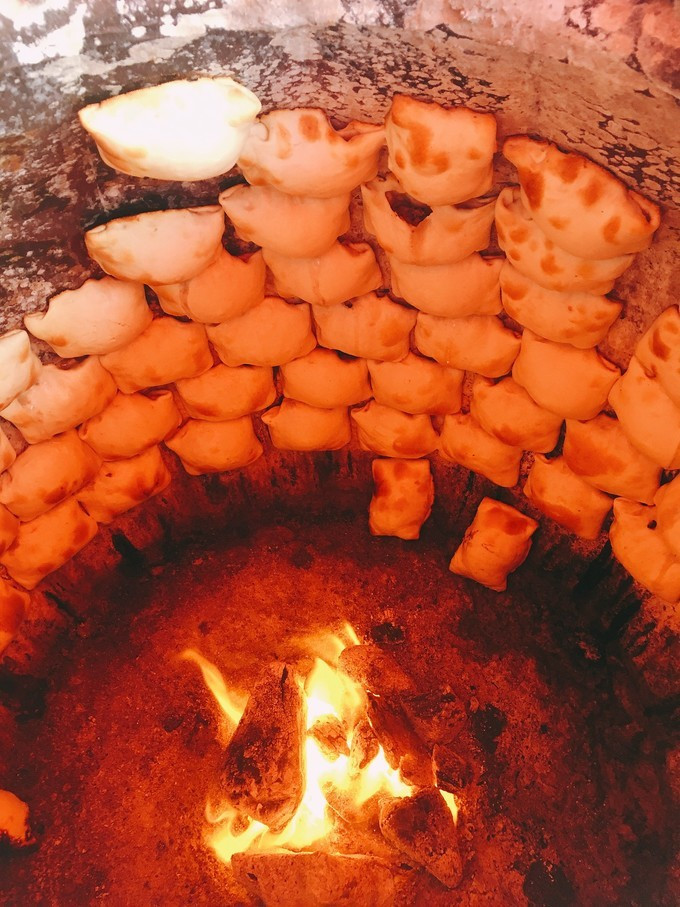 烤包子是维族食物,它的皮又脆又薄。馕炕里的包子鼓足了气,刚被拎出来就被人们一抢而空。一口咬下去,腾地钻进嘴里一阵热气,伴着羊肉和洋葱天然的味道,真香。