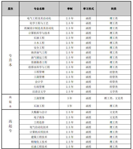 学校及学院概况 东北石油大学(原名东北石油学院、大庆石油学院)位于黑龙江省大庆市,创建于1960年,是一所以工学为主,工、理、管、文、经、法、教育、艺术多学科协调发展的高校。1978年被确定为88所全国重点大学之一。学校是黑龙江省与中国石油天然气集团公司、中国石油化工集团公司、中国海洋石油总公司共建高校,是黑龙江省重点建设的高水平大学。 东北石油大学继续教育学院始建于1977年,继续教育学院历经创办、改革、发展和创新等发展阶段,如今已经成为集成人高等学历教育、非学历教育于一体的综合性教学和管理部门,继续教育已经发展成为学校办学体系的有机组成部分。 多年来,学院秉承学校“质量立校、人才强校、改革创新、特色创优”的办学理念,坚持用大庆精神育人,面向石油石化企业和区域经济建设,坚持“校企合作”、“市校融合”,开展了全方位的办学实践,形成了种类齐全、层次多样、规模较大的继续教育体系。学院开办了高中起点本、专科,专科起点本科,第二学历本科,第二学历专科等五个层次的学历继续教育;开设学历继续教育本、专科专业26种。 学院依托学校的学科专业优势和优良教学传统,创建了一套较完整的教学管理体系,拥有了一支熟悉继续教育特点、教学经验丰富、学术水平较高的专、兼职教师队伍和一支精干的管理人员队伍,保证了教学质量的稳步提高。 近年来,学院先后获得“全国成人高等学校招生工作先进集体”、“黑龙江省成人高等教育先进单位”、“黑龙江省招生考试工作先进集体”、“黑龙江省创先争优活动先进基层党组织”等荣誉称号。如今,学院已经成为东北石油大学服务石油石化企业和区域经济发展的重要窗口。 一、拟招生专业 特别说明:以上拟招生专业仅供参考,最终以黑龙江省招生考试院公布的实际招生专业信息为准。 二、报考须知 1.报名条件 (1)遵守中华人民共和国宪法和法律。 (2)国家承认学历的各类高、中等学校在校生以外的从业人员和社会其他人员。 (3)身体健康,生活能够自理,不影响所报专业学习。 (4)报考高起本或高起专的考生应高级中等教育学校毕业或者具有同等学力。 (5)报考专升本的考生必须是已取得经教育部审定核准的国民教育系列高等学校、高等教育自学考试机构颁发的专科毕业证书、本科结业证书或以上证书的人员。 (6)参加成人高考报名的考生应具有黑龙江省户籍。外省户籍的考生在我省报名,须提供在我省工作、生活的有效凭证,如社保证明、居住证、房产证等,持外省居民身份证且在我省服役的现役军人须提供军官证或士兵证。 注:1、报考本、专科二学历的考生已有的学历层次不得低于所报层次,报名资格审核通过后,可免试入学。本科二学历可免试就读我校专升本,专科二学历可免试就读我校高起专。 2、符合专升本报考条件的退役军人凭有效居民身份证、士兵退役证及符合相应报考条件的学历证书,可申请免试就读我校专升本。 2.报名时间及方式 (1)预报名时间:3月中下旬至9月初。 预报名方式:一种是登录东北石油大学继续教育学院主页,网址:http://jxjy.nepu.edu.cn/(点击2023年成人函授预报名入口);另一种是关注东北石油大学继续教育学院微信公众号(点击右下角“预报名”)。 (2)正式报名时间:预计9月中上旬,具体日期详见黑龙江省招生考试信息港发布的相关通知。 正式报名方式:登录黑龙江省招生考试信息港(www.lzk.hl.cn),进入成人高考网上报名系统进行信息填报,缴费完成后视为报名成功。(本、专科二学历报名费200元/人;其他层次报名费150元/人。) 3.考试时间及考试科目 (1)考试时间: 10月中下旬,具体时间以黑龙江省招生考试信息港发布公告为准。 (2)入学考试科目 注:1、成人高考实行全国统一考试。以上各层次、各科类的统考科目按教育部《全国各类成人高等学校招生复习考试大纲(2020年版)》要求命题。若有变动,以黑龙江省招生考试信息港发布公告为准。 2、成绩查询时间一般在11月下旬,因我省成人高考报名时是预报志愿,考生必须在考试成绩发布后填报正式志愿(包括报本科二学历或专科二学历的考生)。所有统考科目每科满分为150分。高起本、高起专各科考试时间为120分钟,专升本各科考试时间为150分钟。 三、录取 本着公平、公正、公开的原则,在黑龙江省招生主管部门的组织领导下,依照招生计划,由我校在录取最低控制分数线以上按照“从高分到低分择优录取”的原则进行。录取工作结束后,由我校给被录取的考生发放新生录取通知书。新生于次年春季入学。 四、学习形式、教学模式及学费标准 1.学习形式:函授 2.教学模式:网络学习与面授相结合 3.学费标准: 理工类:2000元/年,经管类、文史类、文学类:1800元/年。如有变动,以当年黑龙江省物价部门核准的收费标准为准。 五、毕业与学位授予 1.毕业颁发“成人高等教育毕业证书”,国家承认学历,中国高等教育学生信息网(学信网)可查。 2.本科毕业生符合学位授予条件者,本人可申请学士学位。 六、联系方式 东北石油大学继续教育学院地址:大庆市开发区发展路95号,邮编:163318 东北石油大学继续教育学院网址:http://jxjy.nepu.edu.cn 招生咨询电话:0459-6504075、6504910 成人函授招生问答 报名考试 1、东北石油大学成人函授招生信息在哪里可以看到? 答:可在东北石油大学继