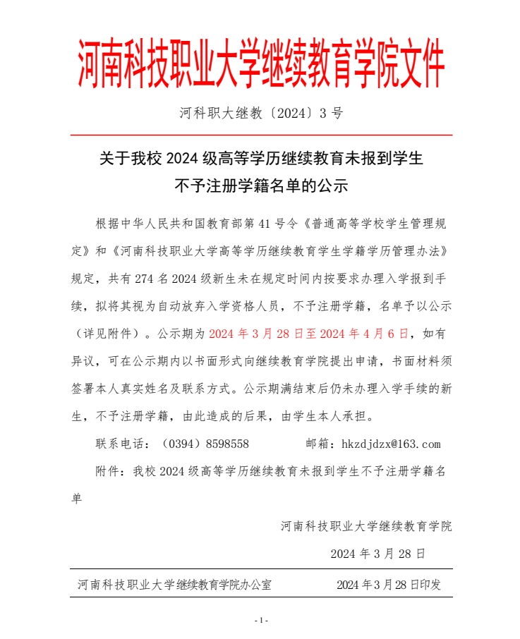 我校 2024级高等学历继续教育未报到学生不予学籍注册名单