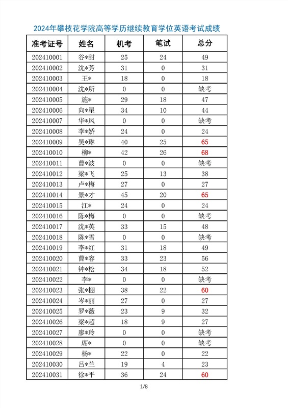 | 2024年攀枝花学院高等学历继续教育学位英语考试成绩