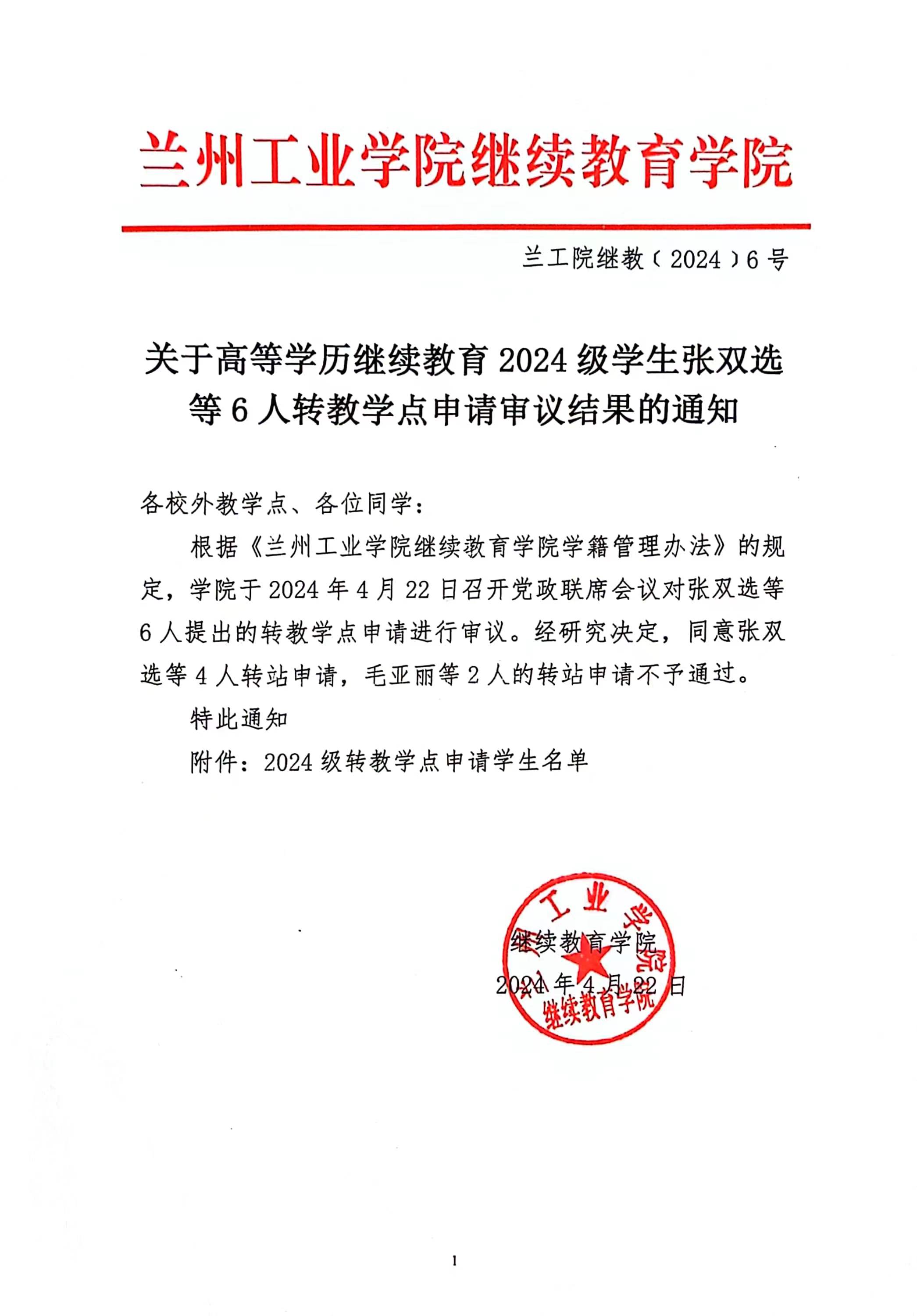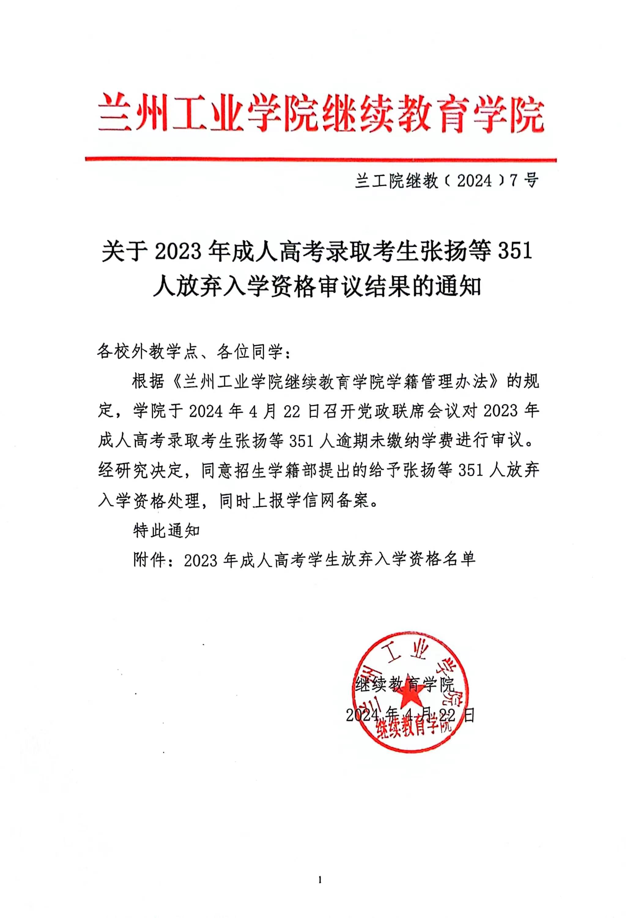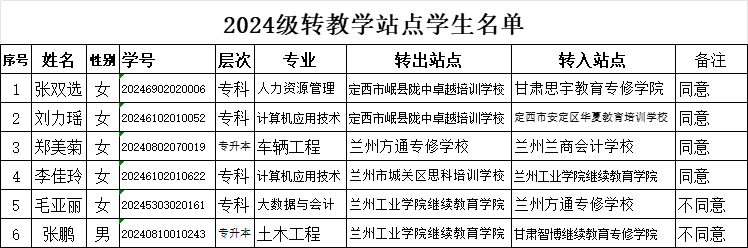 关于对成人高等学历继续教育张扬等351名学生未缴费按照放弃入学不予注册及张双选等6名学生转教学点的公示 根据《兰州工业学院继续教育学院学籍管理办法》的规定,学院于2024年4月22日召开党政联席会议对2023年成人高考录取考生张扬等351人逾期未缴纳学费进行审议。经研究决定,同意招生学籍部提出的给予张扬等351人放弃入学资格处理,同时上报学信网备案。 根据《兰州工业学院继续教育学院学籍管理办法》的规定,学院于2024年4月22日召开党政联席会议对张双选等6人提出的转教学点申请进行审议。经研究决定,同意张双选等4人转站申请,毛亚丽等2人的转站申请不予通过。 按照管理规定现将学生名单公示如下(见下图),公示期自2024年4月23日至2024年4月30日,如有异议请在公示期反馈,超期则视为无异议,将按照学籍管理规定流程办理。 ![]() ![]() ![]() |