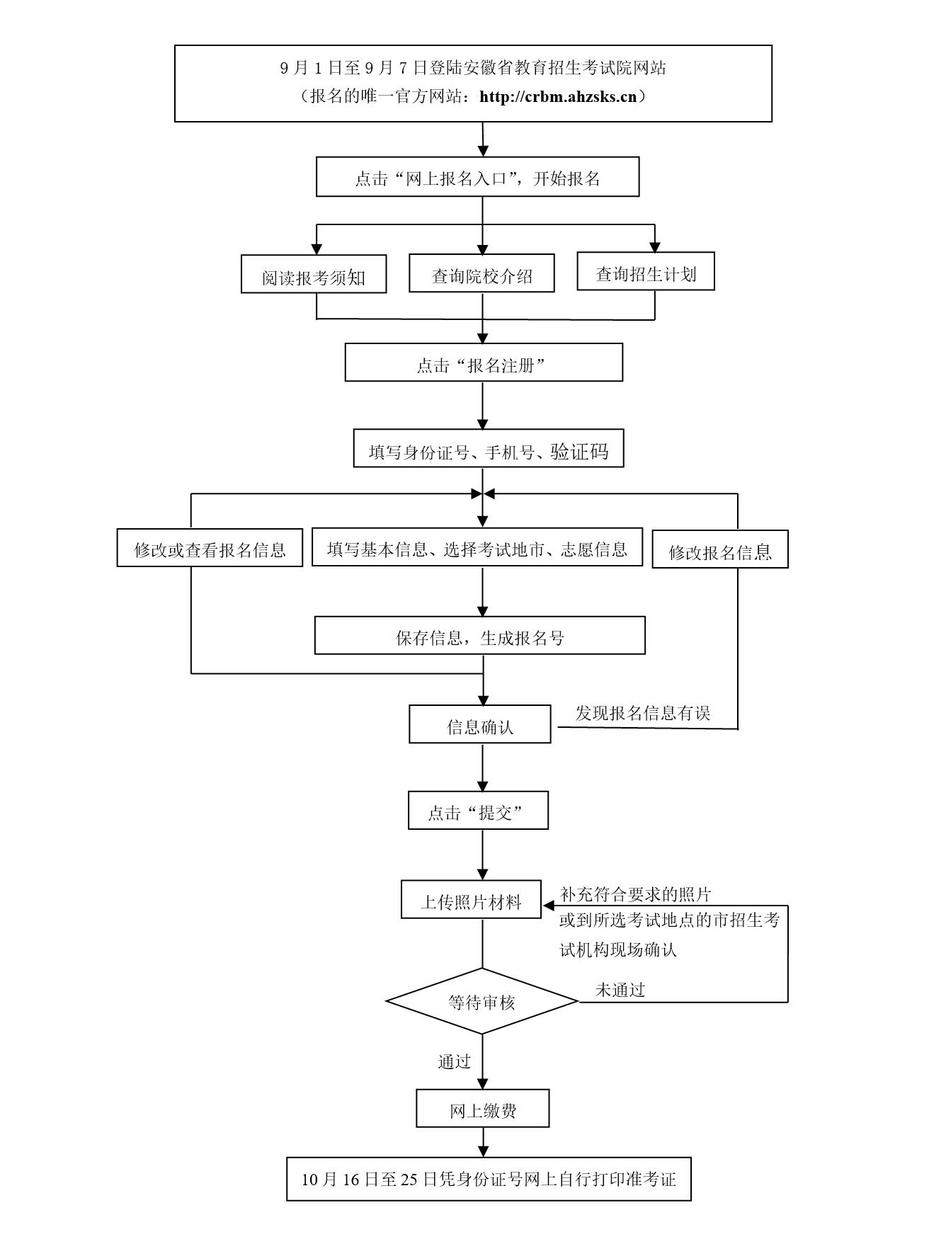 安徽省2020年成人高校全国统一招生考试(以下简称成人高考)网上报名工作将于9月1日-7日进行。为切实方便考生,落实疫情防控常态化要求,经研究决定,我省2020年成人高考试行网上确认。现将有关事项公告如下: 一、成人高考网上信息确认安排 1、网上确认对象 所有在安徽省报考成人高考的考生。报名工作由网上报名、网上确认和网上缴费三部分组成,网上确认审核通过的考生,还必须在规定时间内进行网上缴费、网上打印准考证等后续工作。 2、时间安排 网上报名、上传相关材料时间为9月1日-9月7日(8:00-22:00)。网上审核不通过,需要补交材料的截止时间为9月10日17:00。网上缴费截止时间为9月12日22:00。逾期不再办理。 请考生务必在规定时间内登录网上报名系统上传相关材料。上传材料包括本人证件照(准考证照)、有效居民身份证原件人像面和国徽面照片、手持身份证照片等。报考专升本层次的考生还需毕业证书(证明)照片,外省身份证的考生还需户口本或社保证明等材料照片。网上确认仅支持PC端,请考生准备好相关材料电子版。 二、网上报名确认流程 ![]() 三、审核结果的反馈 1、各市招生考试 机构负责对考生进行网上审核。考生提交确认材料后,各市招生考试 机构将所传照片与公安户籍等系统进行人像比对,结果将作为审核考生报考资格的依据。 2、网上确认期间,请考生及时关注网上报名系统对审核结果的反馈提示,并保持手机通信畅通。一般情况下,考生上传材料结束后,网上确认结果将在36小时内通过报名系统反馈(单日提交材料考生人数过多及特殊情况除外)。 3、审核结果为“通过”的考生,即完成网上信息确认,不需再到现场审核,并请立即缴纳报考费用。 4、审核结果为“未通过”的考生,请在36小时内登录网上报名系统及时补充符合要求的材料或根据要求持相关材料到网上报名时选择的考试地点所在市招生考试 机构进行现场审核确认。 四、注意事项 1、特别提醒:考生须保证本人符合所报专业的报名条件和要求,所填写和提供的个人信息、证明材料、证件等真实、准确、有效。如因不符合报名条件和要求或提供虚假材料,导致不能考试、录取、学籍注册的,责任由考生自负。 2、考生应于规定时间完成相关材料的上传,逾期不再补办。并及时关注网上确认系统对审核结果的反馈提示,以免因审核不通过没有充足的时间准备补充材料而错失报名时间。 3、网上缴费截止时间为9月12日22:00,考生须在此时间之前登录报名系统进行网上缴费。未在规定时间内缴费视为报名无效,不得参加考试。 4、报名期间咨询电话另行公布。 附件:网上确认所需上传材料及相关要求 附件: 网上确认所需上传材料及相关要求 考生在规定时间进入网上信息确认界面,上传本人证件照片(准考证照片)、身份证(人像面和国徽面)照片、手持身份证照片及其它相关材料照片等手续。具体材料照片要求如下: 1、本人证件照片。上传本人近三月内正面、免冠、无妆、彩色电子证件照,照片要求见下图: ![]() 2、本人有效居民身份证原件人像面和国徽面照片,照片要求身份证边框完整,字迹清晰可见,亮度均匀。 3、本人手持身份证照片,照片要求见下图: ![]() 4、报考专升本层次的考生 上传大学专科(及以上)毕业证书或学信网学历认证报告照片。2021年春季毕业的应届专科毕业生拍照上传所在学校出具的《毕业生证明》照片。 5、外省身份证的考生 户籍系我省的,须上传户口本照片; 户籍系外省在皖工作的,须上传居民居住证照片或近三个月的缴纳社会保险凭证(社保机构盖章)或缴纳个人所得税凭证(税务部门盖章)的照片等证明材料。 请务必谨慎上传符合上述全部要求的照片,否则会影响审核。 |