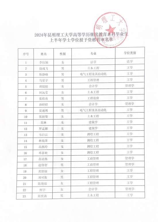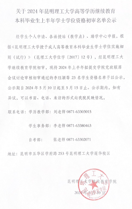 关于2024年昆明理工大学高等学历继续教育本科毕业生上半年学士学位资格初审名单公示