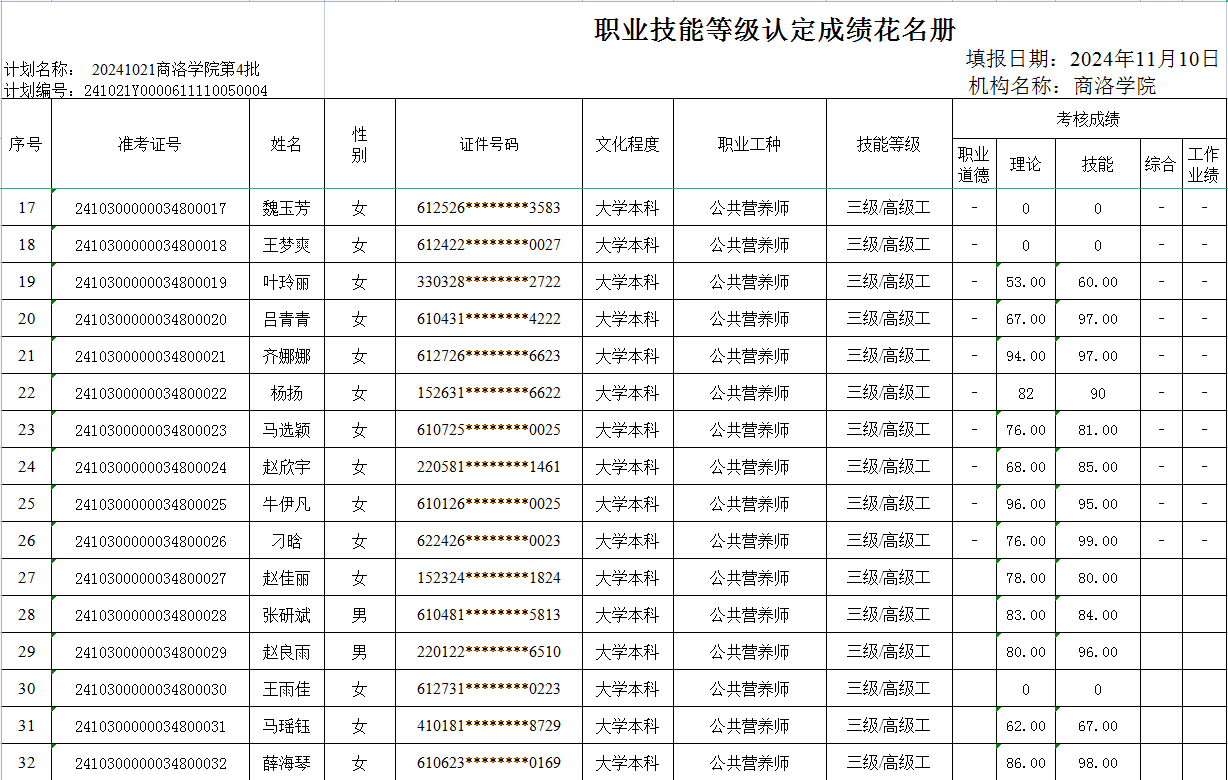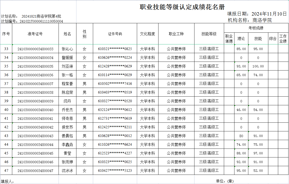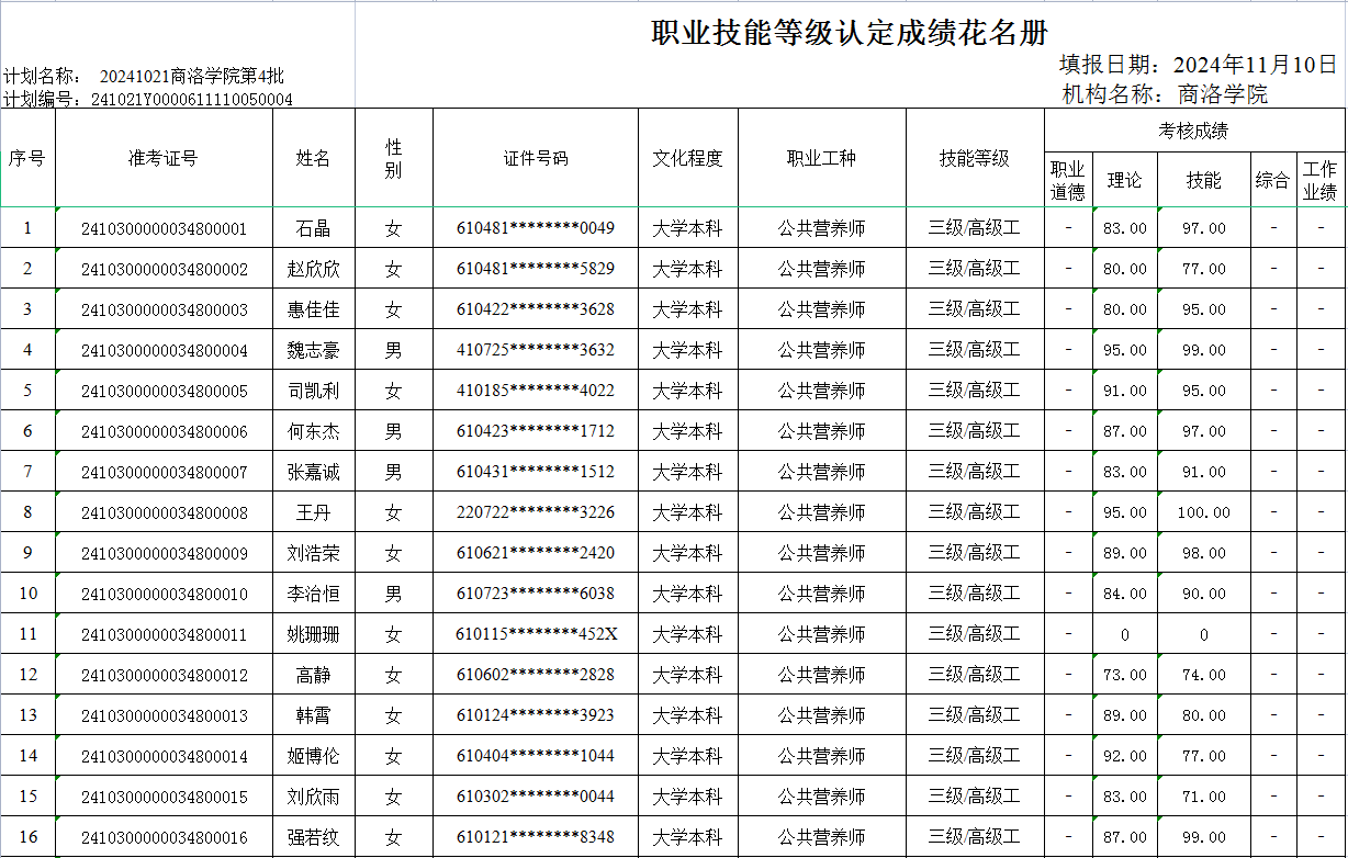 | 职业技能等级认定2024年11月10日成绩公示