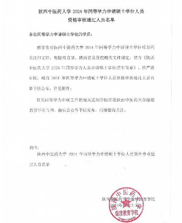 | 陕西中医药大学2024年同等学力申请硕士学位人员资格审核通过人员名单